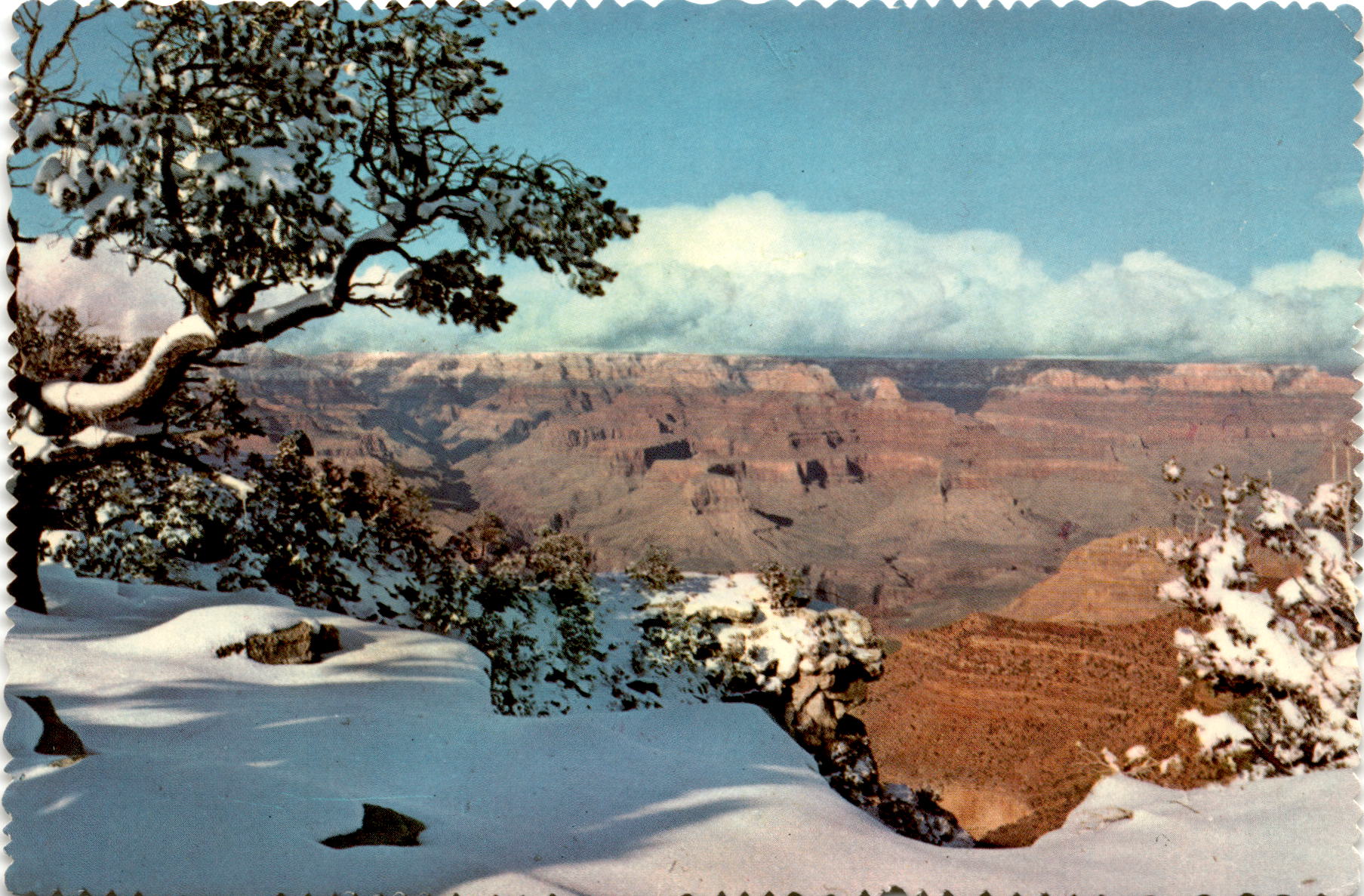 The postcard features a winter scene of the Grand Canyon National Park in Arizona, specifically mentioning Verkamp’s, Inc. The South Rim of the Grand Canyon experiences an average winter snowfall of about 3 feet, transforming the canyon into a magical winter wonderland.