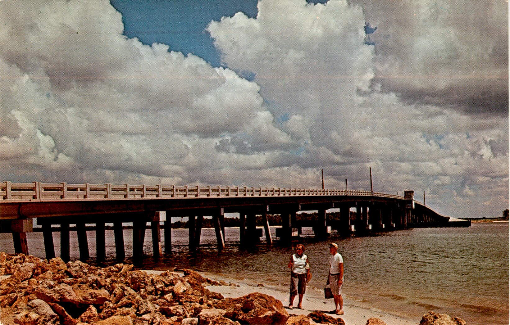 Back of PostcardThis postcard features an image of two fishermen at the Bonita Bridge, which connects Fort Myers Beach, Florida to Bonita. The Bonita Bridge is a popular spot for fishing due to its location over the water, providing easy access for anglers to catch fish.
