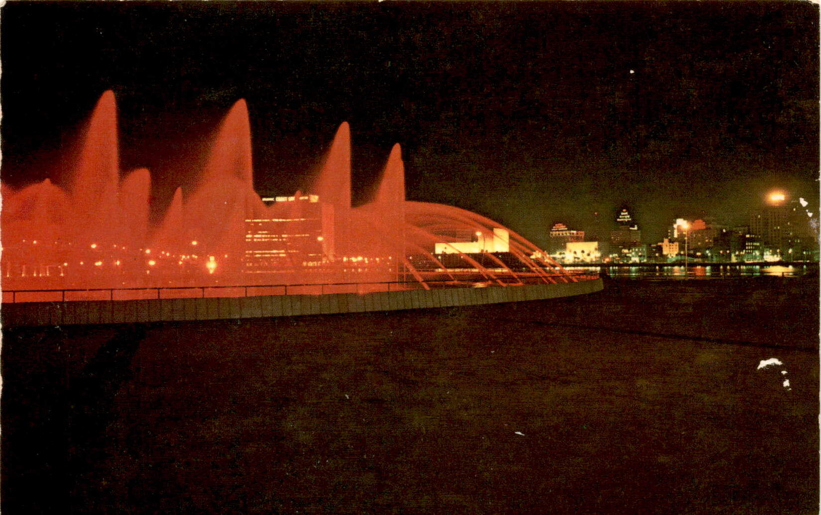 The postcard features a color photo of Downtown Jacksonville in Florida, taken from Dallas Thomas Park and Marina. The main focus is the spectacular Cascade of the Fountain of Friendship, which almost covers the view. The photo was captured by John V. Pontiere, Jr. for the National Post Card Service based in Sebring, Florida.