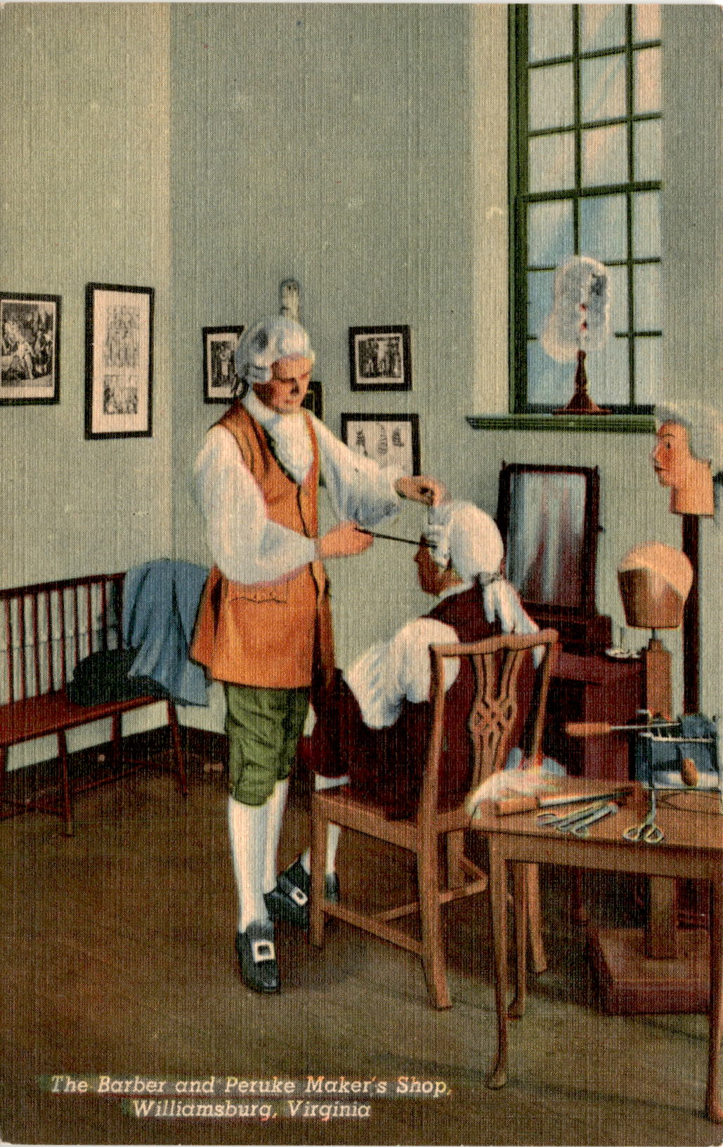 This postcard features an image of the Barber and Peruke Maker’s Shop in Williamsburg, Virginia. The building was originally an apothecary shop but has been restored to its former state where a peruker now creates and fixes wigs.