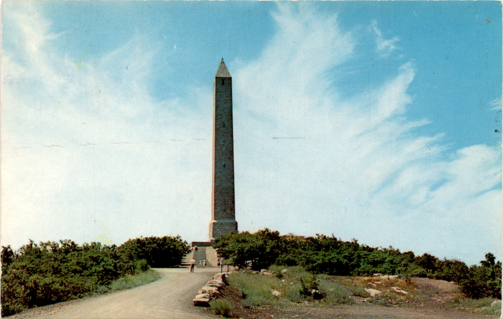 The postcard features a picture of the High Point Monument in High Point State Park, New Jersey. The monument stands at 1803 ft above sea level and is 220 ft tall, offering panoramic views of three states: New Jersey, New York, and Pennsylvania. The postcard was made by Dexter Press, Inc. in West Nyack, N.Y.