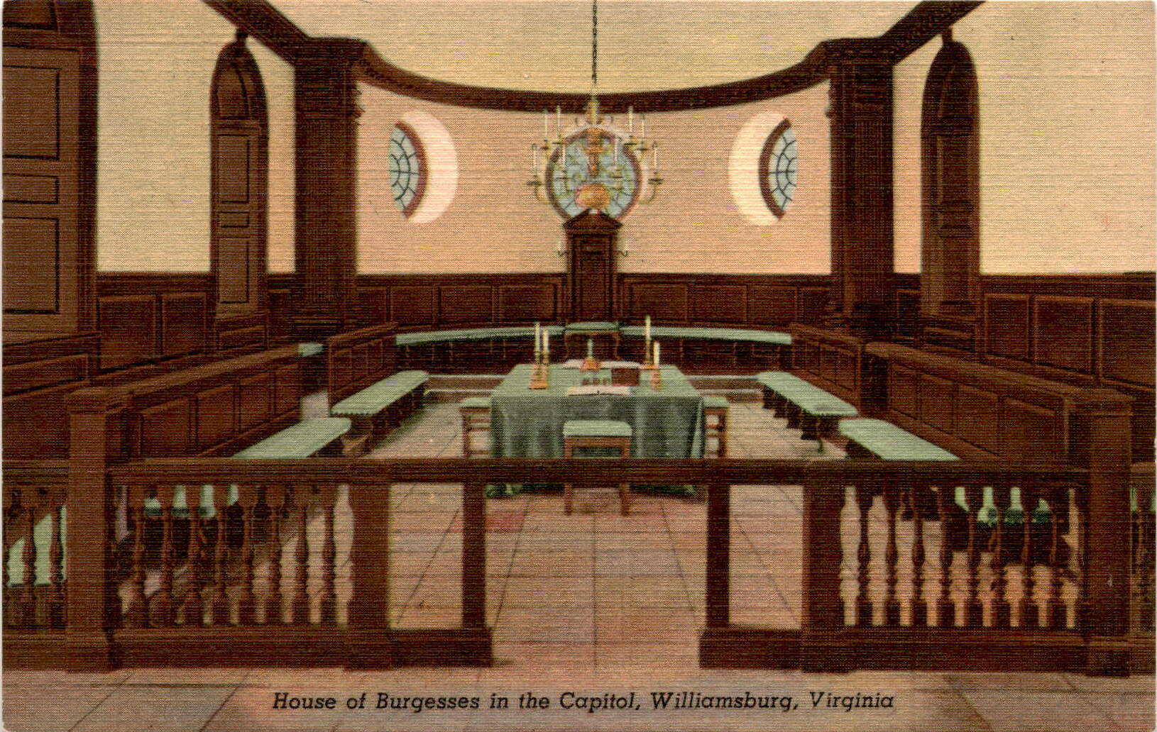The postcard depicts the House of Burgesses in the Capitol building in Williamsburg, Virginia. The House of Burgesses was the legislative assembly in the Virginia Colony, established in 1619, making it one of the oldest representative bodies in the English colonies. The Capitol building, completed in 1705, was the meeting place for the House of Burgesses.
