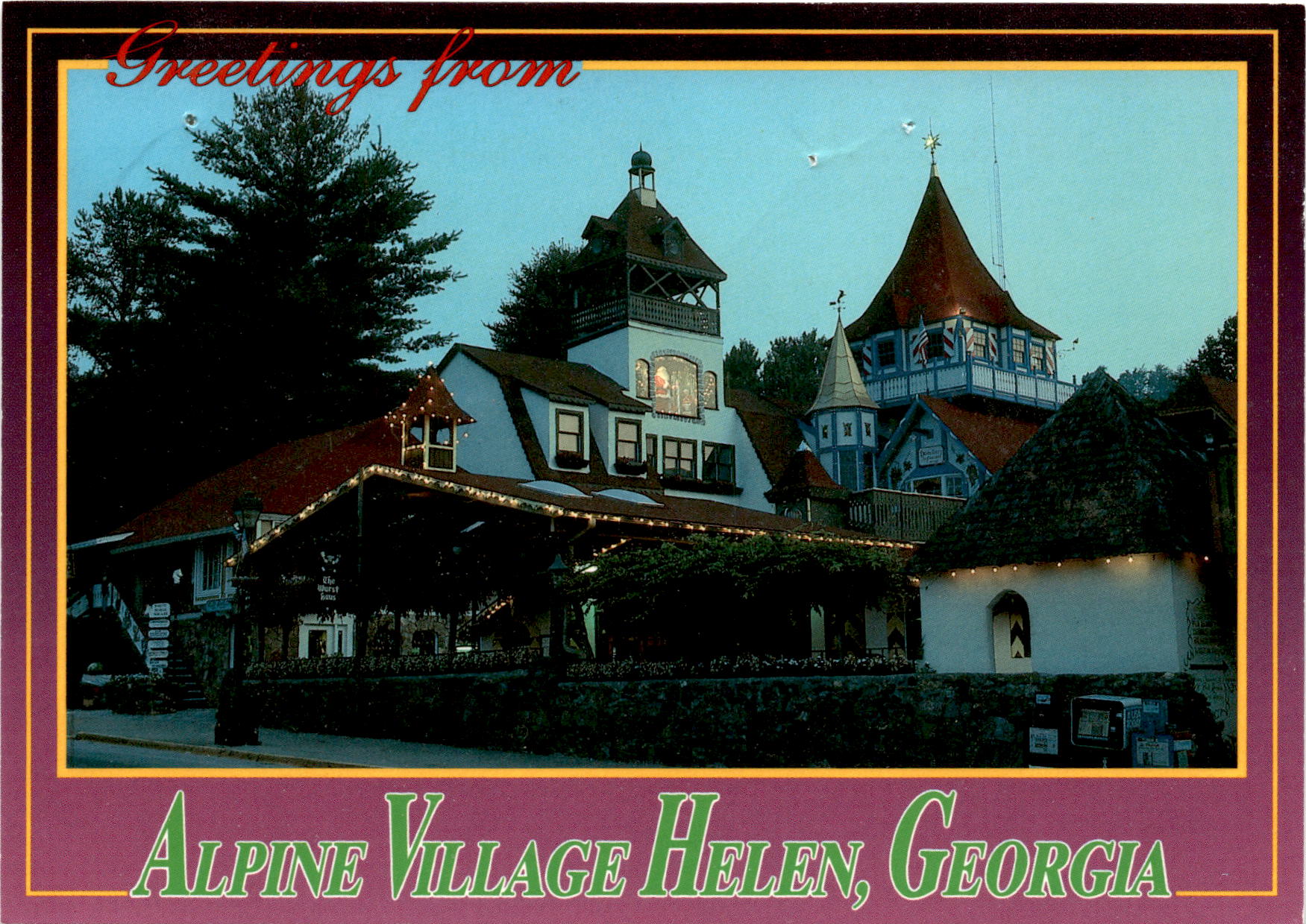 Back of PostcardThe postcard features a photo of Alpine Helen, a Bavarian-style village located in Helen, Georgia, surrounded by the Blue Ridge Mountains. The village is known for its charming architecture, with cobblestone streets and traditional Bavarian shops. The locals are often seen dressed in dirndls and lederhosen, adding to the village’s picturesque and welcoming atmosphere.