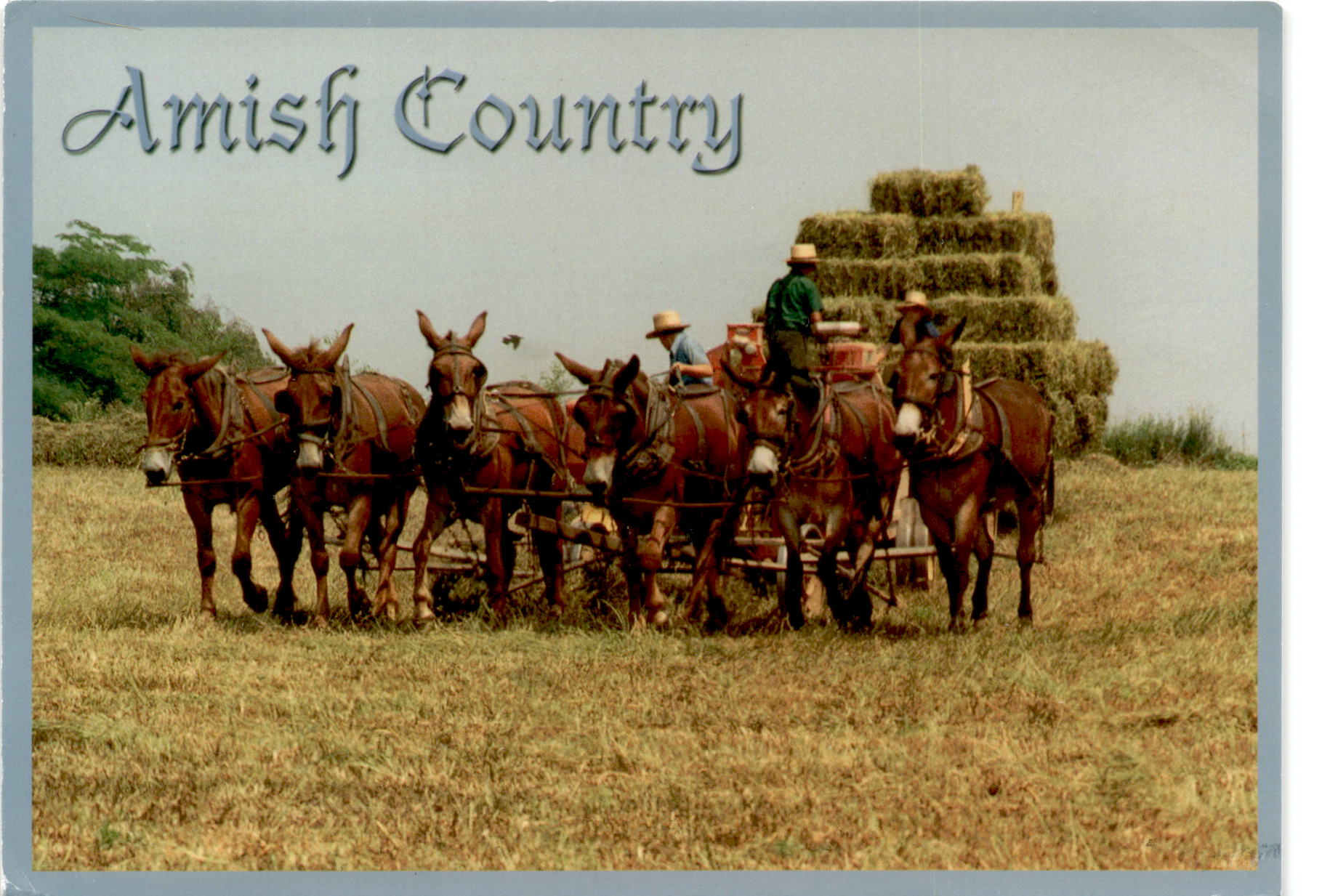 The postcard features a photograph titled Amish Seasons showing the process of baling hay in Amish Country. The photo was taken by Steve Witmer. The address on the postcard is for Glenn Ritter in New Holland, Pennsylvania. The postcard includes a quote, There is a season, and mentions the Amish Seasons Collection.