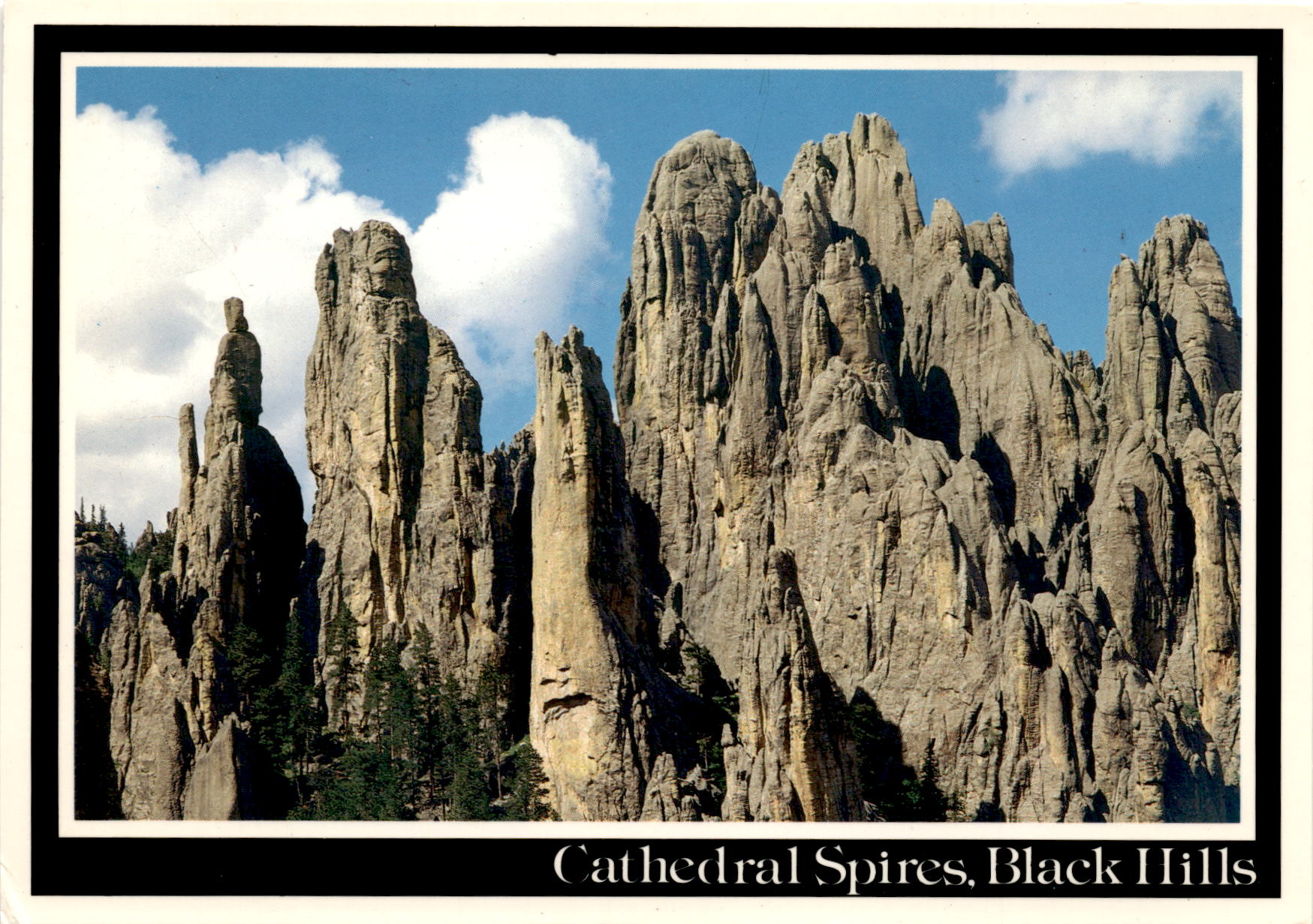 The postcard describes a visit to Cathedral Spires in the Black Hills of South Dakota. Cathedral Spires are massive rock formations carved by nature from solid granite, resembling towering needles. The Needles Drive is a famous scenic route in the Black Hills that offers stunning views of these spires.