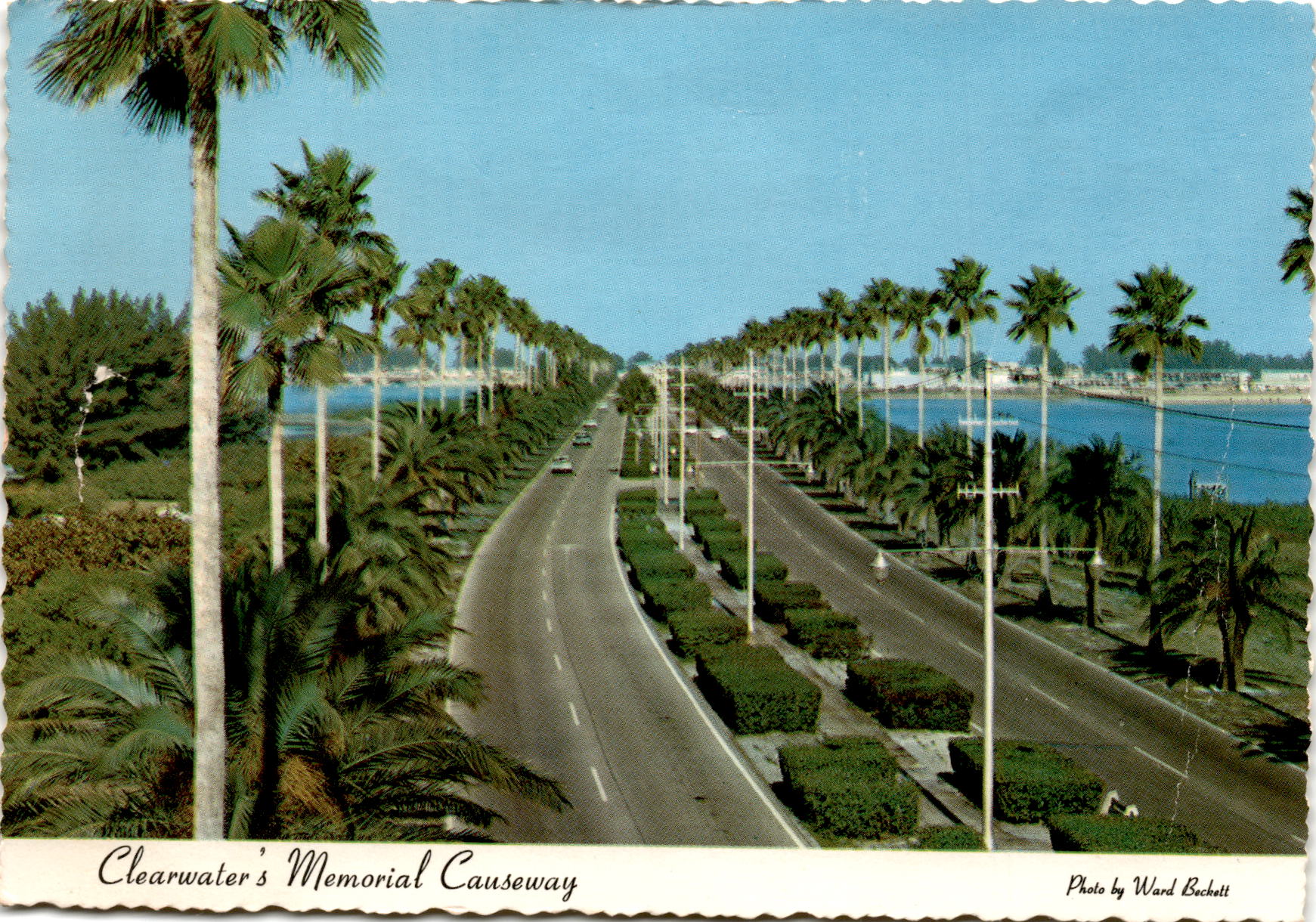 The front of the postcard features a photo of Clearwater’s Memorial Causeway taken by Ward Beckett. The Memorial Causeway is a prominent bridge in Clearwater, Florida, connecting the city to Clearwater Beach. It serves as a significant landmark and a crucial transportation route for residents and visitors.