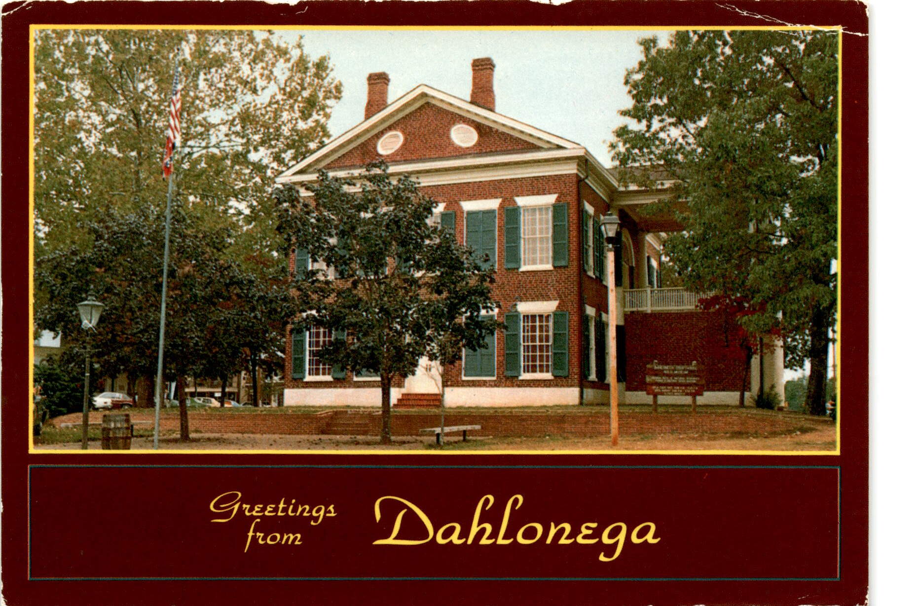 The postcard is a greeting from Dahlonega, Georgia, known for its Gold Museum. The town square features the old courthouse, which now houses exhibits and slides detailing the history of the gold discovered in the area. Dahlonega gets its name from the Cherokee Indian language, meaning precious yellow metal.
