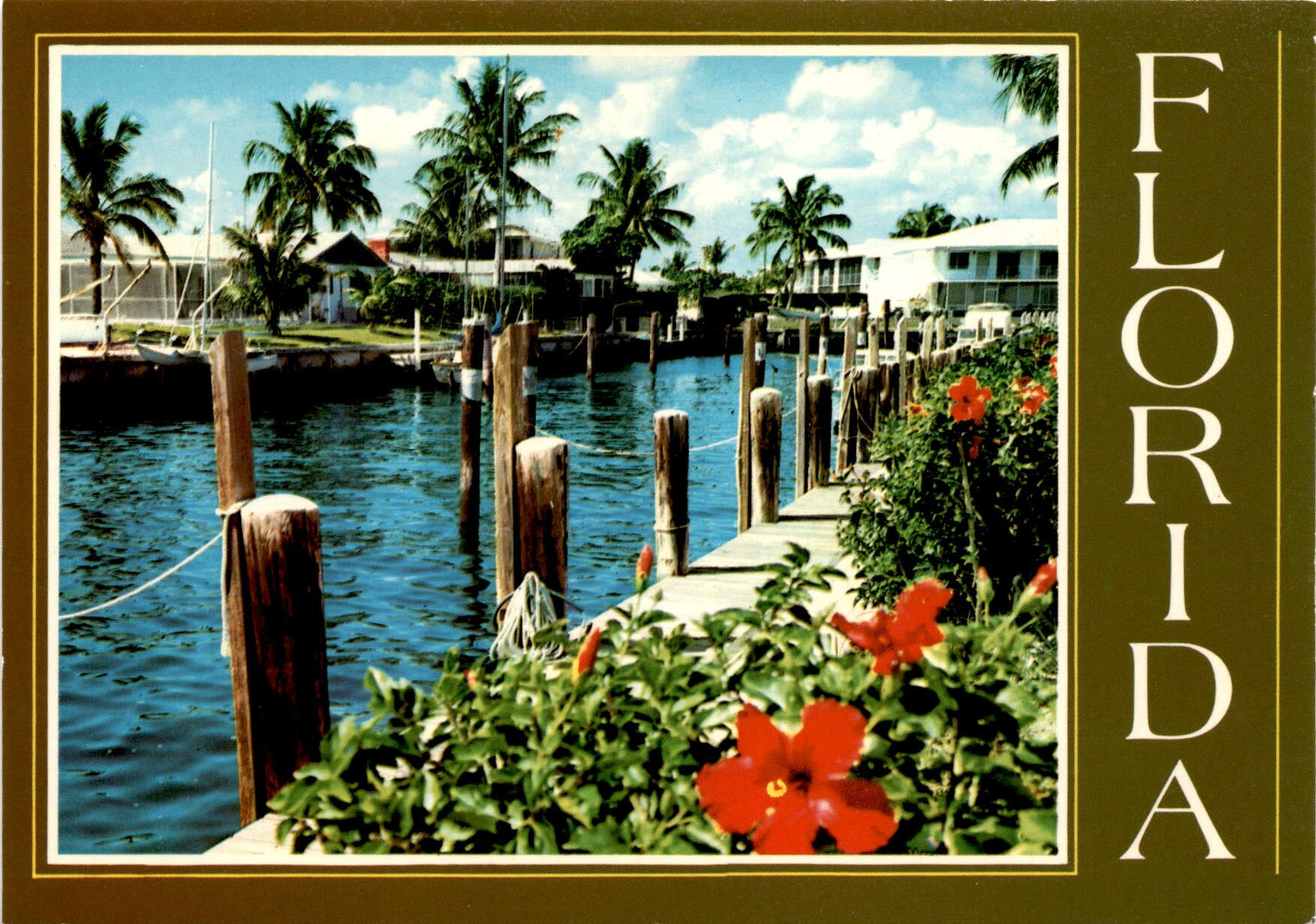 The postcard features a picturesque view of Florida, known as the Sunshine State and Land of Flowers in Spanish. Florida has a rich history dating back to the fifteenth century when Ponce De Leon explored the region. It boasts over 1,500 miles of coastline, numerous rivers, streams, and lakes teeming with game fish and marine life.