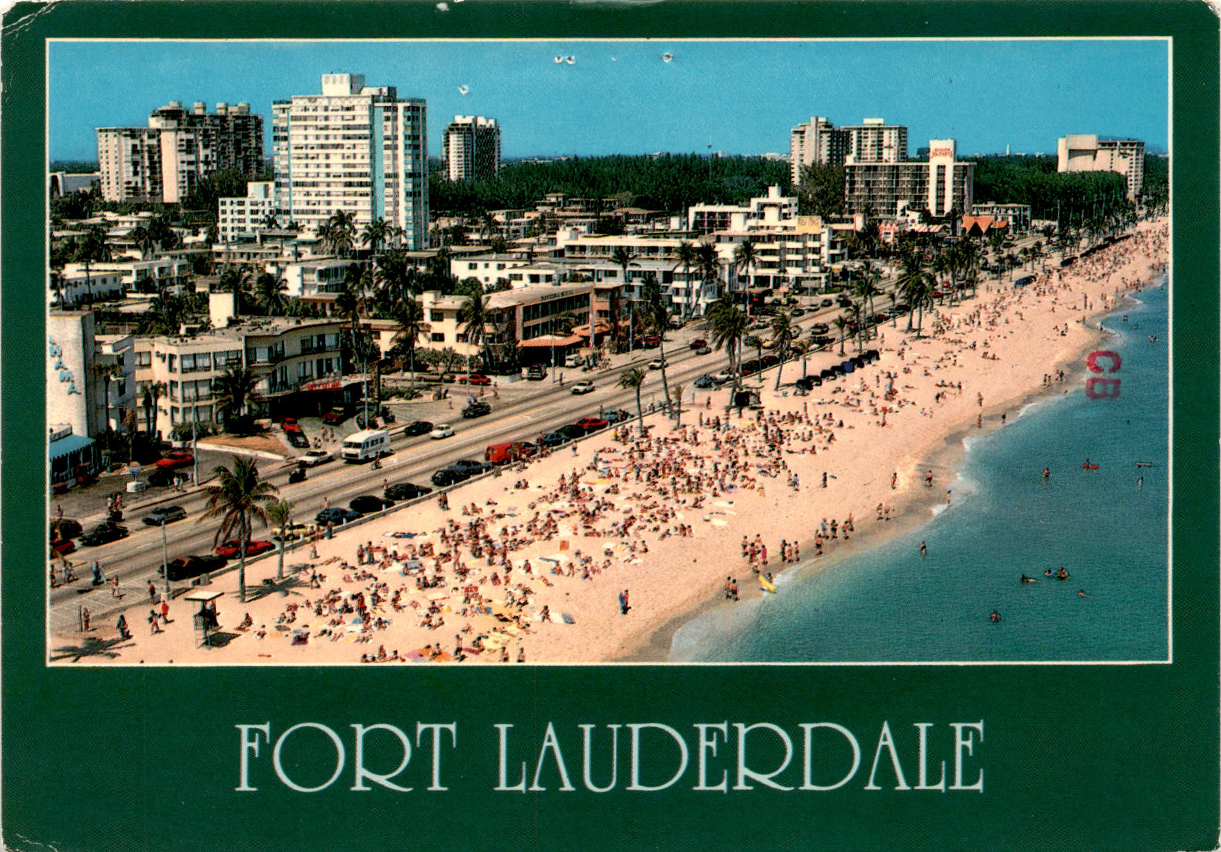 The postcard is a promotional image of Fort Lauderdale Beach in Florida, known for its unobstructed stretch of beach that is cooled by Trade Winds in the summer and warmed by the Gulf Stream in the winter. The postcard mentions the temperature being 85° and describes the weather as very warm and beautiful.