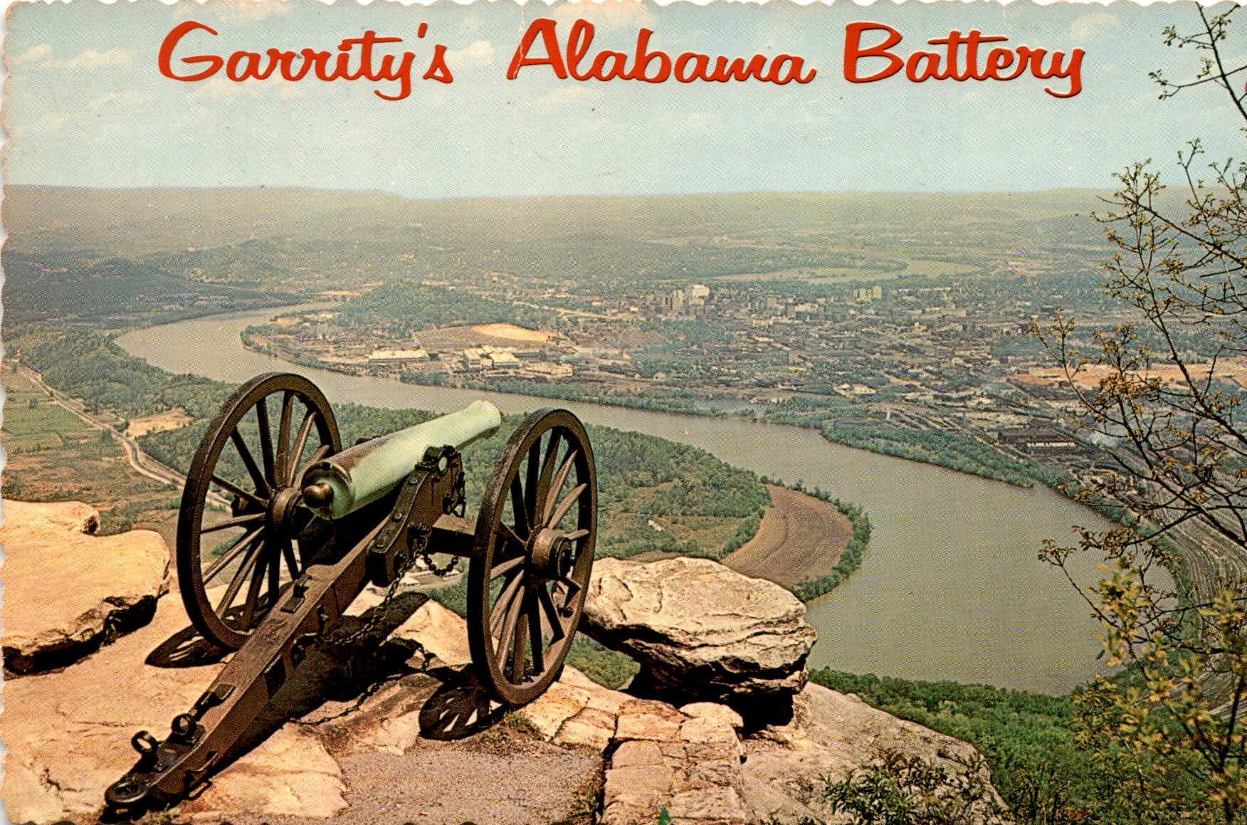 The front of the postcard features a picture of Garrity’s Alabama Battery on Lookout Mountain, Tennessee. The battery’s cannon is shown overlooking Chattanooga. The postcard was distributed by the Southern Post Card Co. and produced by Plastichrome, a brand of COLOURPICTURE in Boston, Massachusetts.