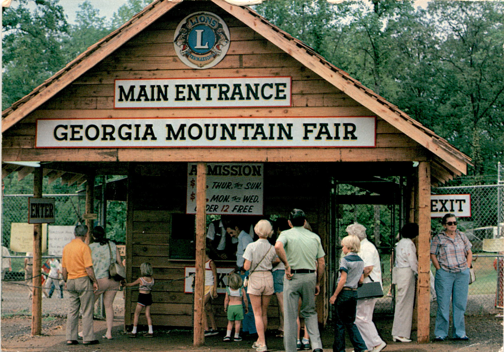 The postcard advertises the Georgia Mountain Fair in Hiawassee, Georgia, organized by the Towns County Lions Club. The fair features traditional and non-commercial attractions such as Native Mountain Crafts, Pioneer Village, Nature Walk, and a 3500-capacity Music Hall. The fair runs from Thursday to Sunday, with free admission for children under 12.