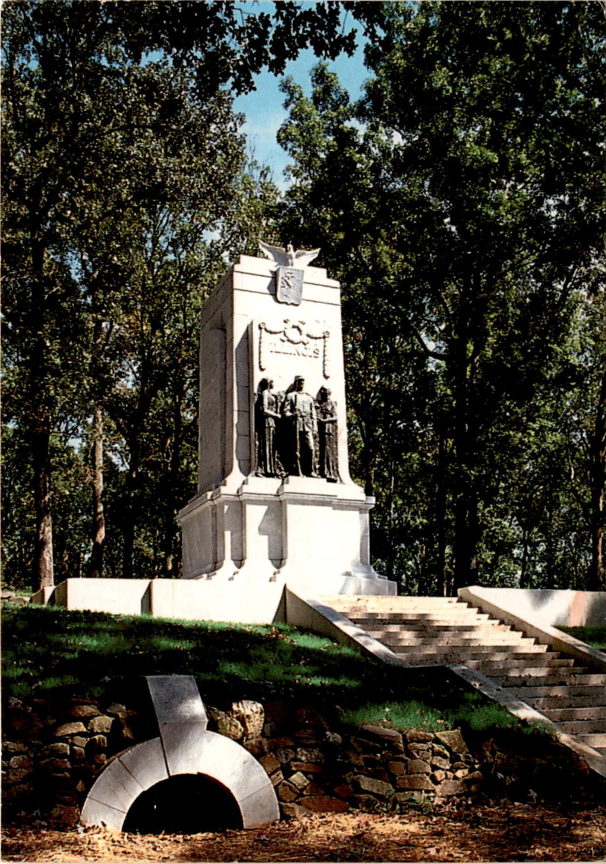 The postcard depicts the Illinois Monument at Kennesaw Mountain National Battlefield Park in Marietta, Georgia. The monument was dedicated by Union veterans 50 years after the Battle of Kennesaw Mountain to honor their fallen comrades from the Civil War.