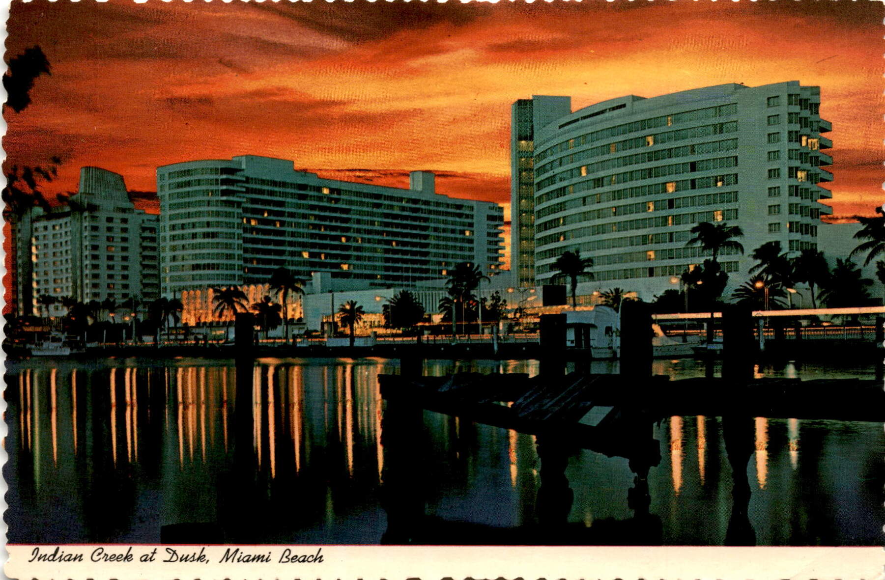 The postcard depicts Indian Creek at dusk in Miami Beach, with luxury hotels lining the Atlantic Ocean in the background. Indian Creek’s headwaters originate in Lake Pancoast, and it flows northward to eventually empty into Biscayne Bay. Originally a shallow tidal stream, Indian Creek has been widened and deepened over time.
