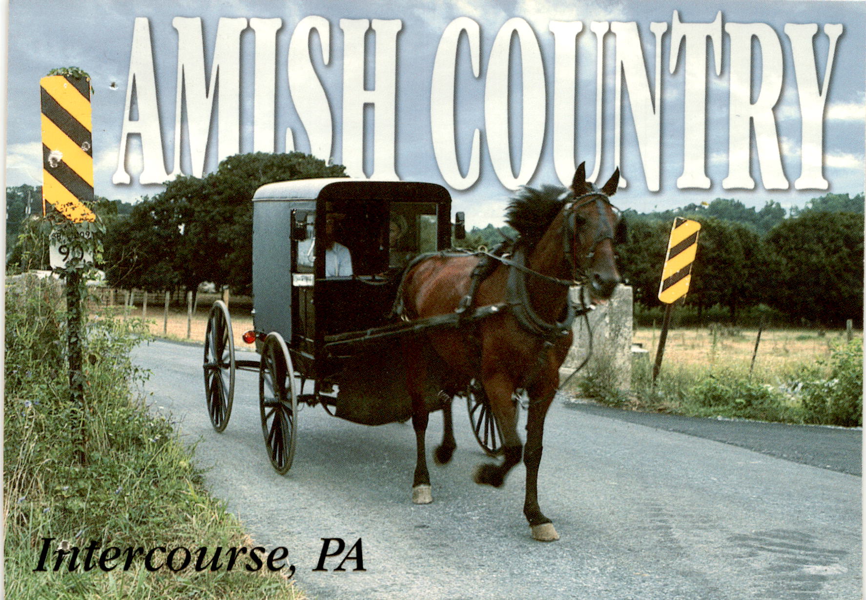 Back of PostcardThe postcard features an image of Amish Country in Intercourse, Pennsylvania. The Amish community in this region is known for their traditional way of life, which includes using horse and buggy as their main mode of transportation. Intercourse is a small village in Lancaster County, Pennsylvania, that is well-known for its Amish population and picturesque countryside.
