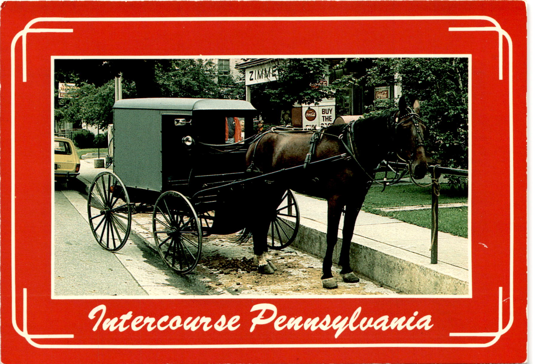The postcard features a photograph of an Amish carriage tied to a hitching post outside a business in the village of Intercourse, located in Pennsylvania’s Amish Country. Intercourse is a small town known for its Amish community and traditional way of life. Horse and buggy traffic is a common sight in the village, sometimes outnumbering motor vehicles.