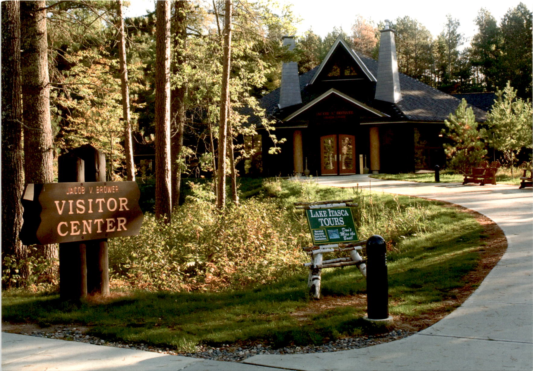 The postcard advertises the Jacob V. Brower Visitor Center at Lake Itasca, which offers tours and educational displays about the history of Itasca State Park. The center is 13,000 square feet and was dedicated in 2002. The postcard features a photograph by Peter Hawkins Photography, Inc. and includes a Lazy Loon postcard design.