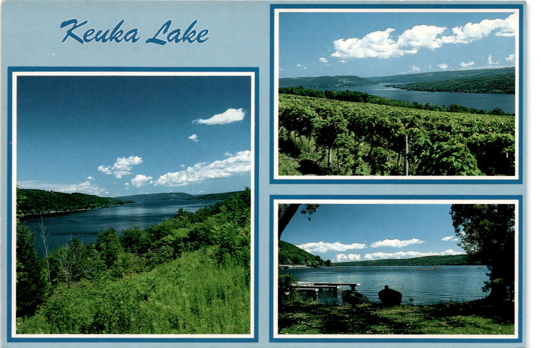 Back of PostcardKeuka Lake, originally named The Crooked Lake by the Seneca Indians, is known for its stunning beauty. The lake is one of the Finger Lakes in New York State, located between the cities of Penn Yan and Hammondsport. Keuka Lake is unique in that it is Y-shaped, with a central body and two branches.