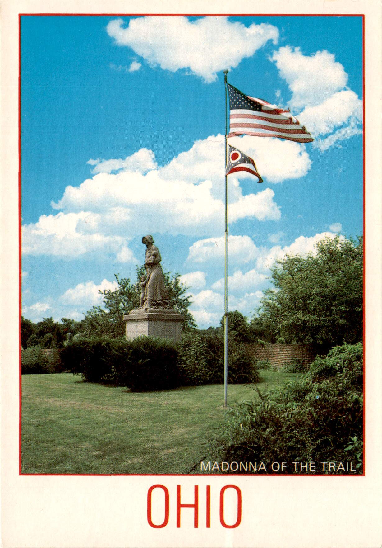 The postcard features an image of the Madonna of the Trail monument, a memorial dedicated to pioneer mothers of the covered wagon days. The monument was erected in Springfield, Ohio, near the corporation line on old Route 40 West and was dedicated on July 4, 1928. The image on the postcard was taken by F.