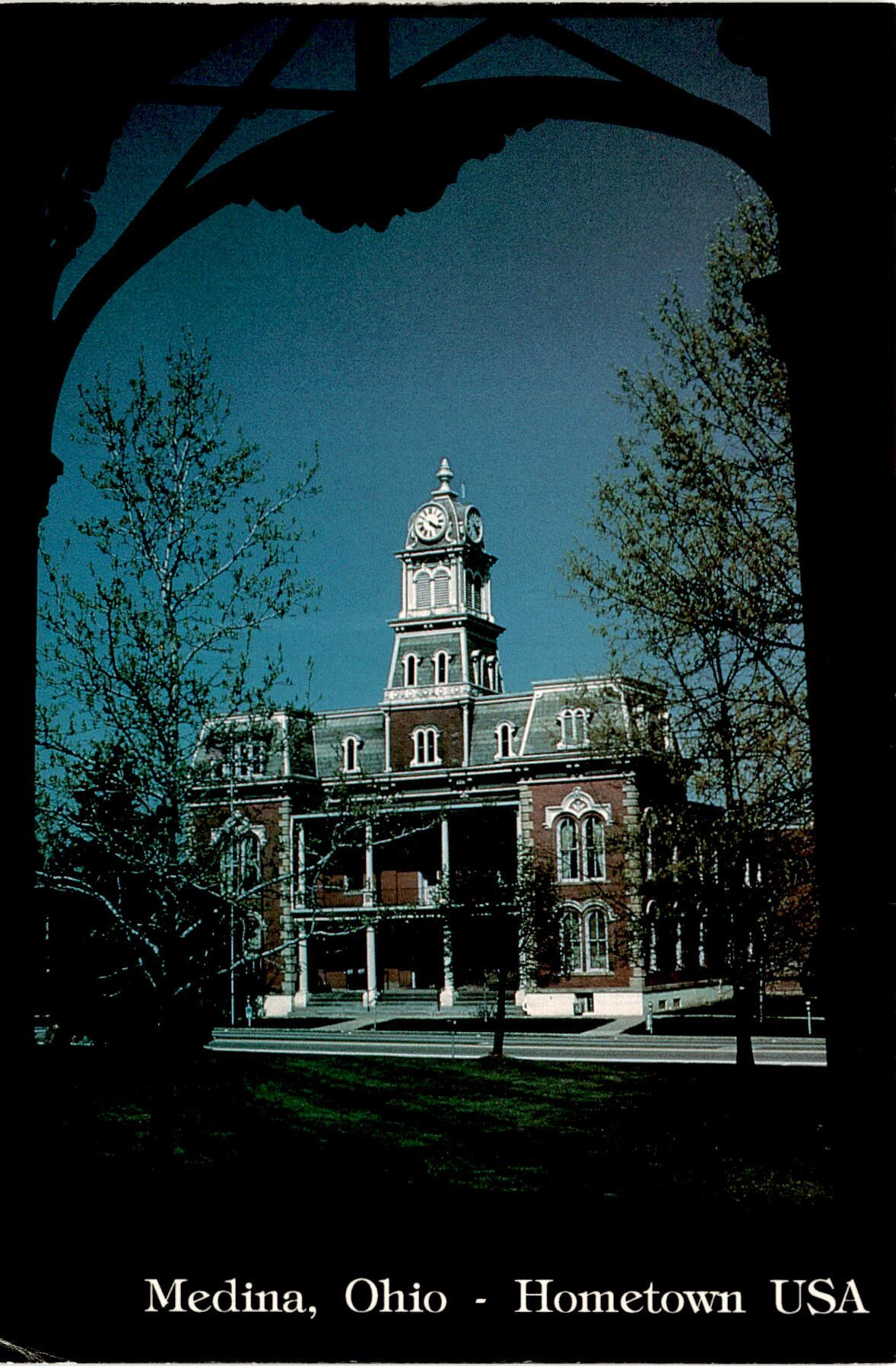 The postcard features a photograph of the Medina County Courthouse in Medina, Ohio. The courthouse was originally built in 1841 in the Greek Revival architectural style. In 1873, it was remodeled into a Victorian style building. The courthouse is significant enough to be listed in the National Register of Historic Places.