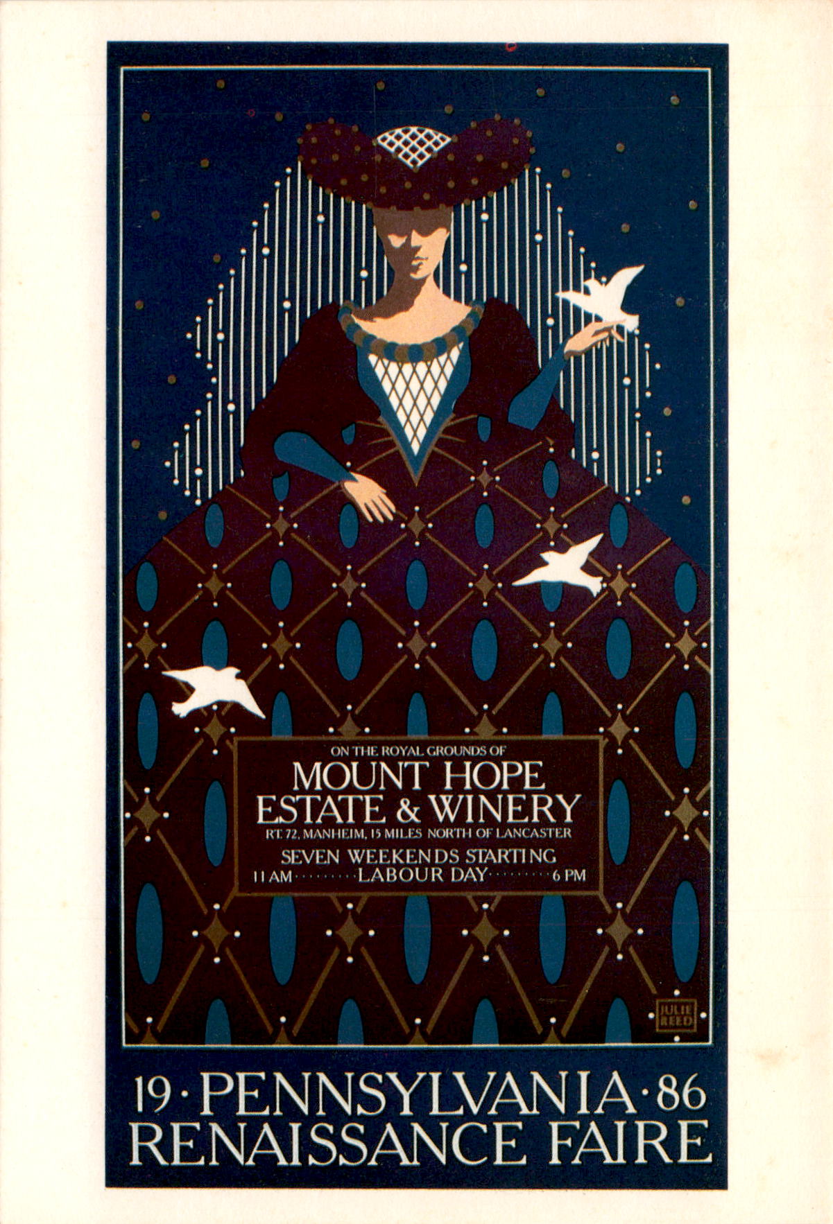 The postcard advertises the Renaissance Faire held at Mount Hope Estate & Winery in Manheim, Pennsylvania. The event takes place over seven weekends starting on Labor Day, from 11 am to 6 pm. The Faire promises pageantry and merrymaking in the style of a 16th Century Elizabethan Country Faire.