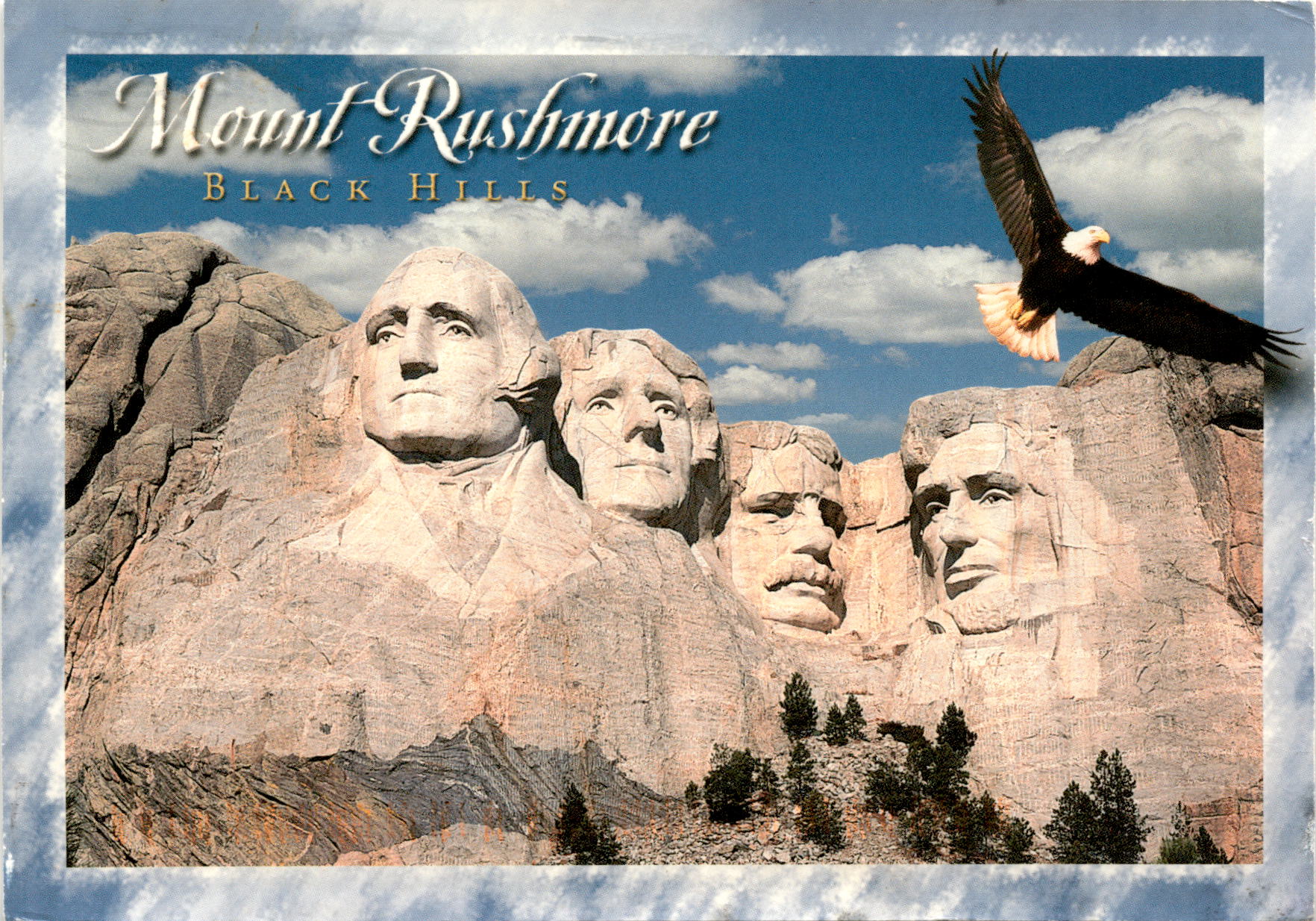 The postcard features an image of Mount Rushmore, a famous monument located in the Black Hills of South Dakota. The front of the postcard shows a rock sculpture of Mount Rushmore with an American Bald Eagle flying over it.