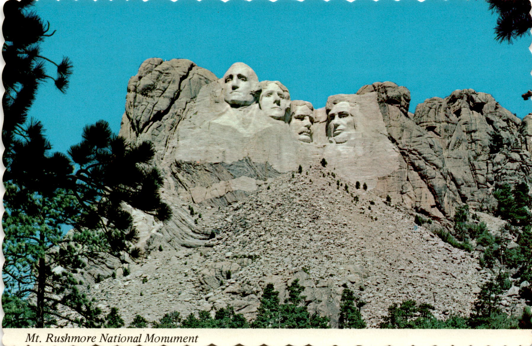The postcard features an image of Mt. Rushmore National Memorial, located in the Black Hills of South Dakota. The monument depicts the faces of four U.S. presidents – George Washington, Thomas Jefferson, Theodore Roosevelt, and Abraham Lincoln – carved into the granite mountain. It is illuminated by 100,000 watts, showcasing the faces in their heroic proportions.