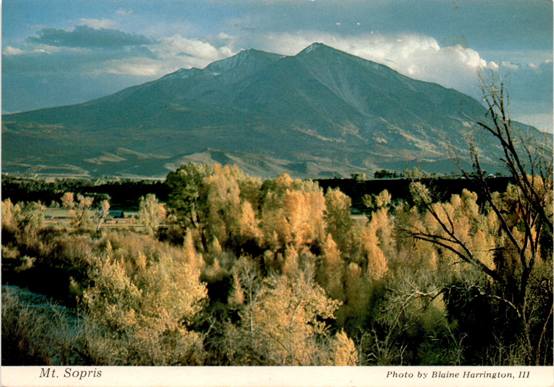 The postcard features a photo of Mt. Sopris, a prominent peak with an elevation of 12,953 feet located near Carbondale, Colorado in the Elk Range. Mt. Sopris is known for its stunning beauty and is a popular destination for hikers and outdoor enthusiasts in the region.