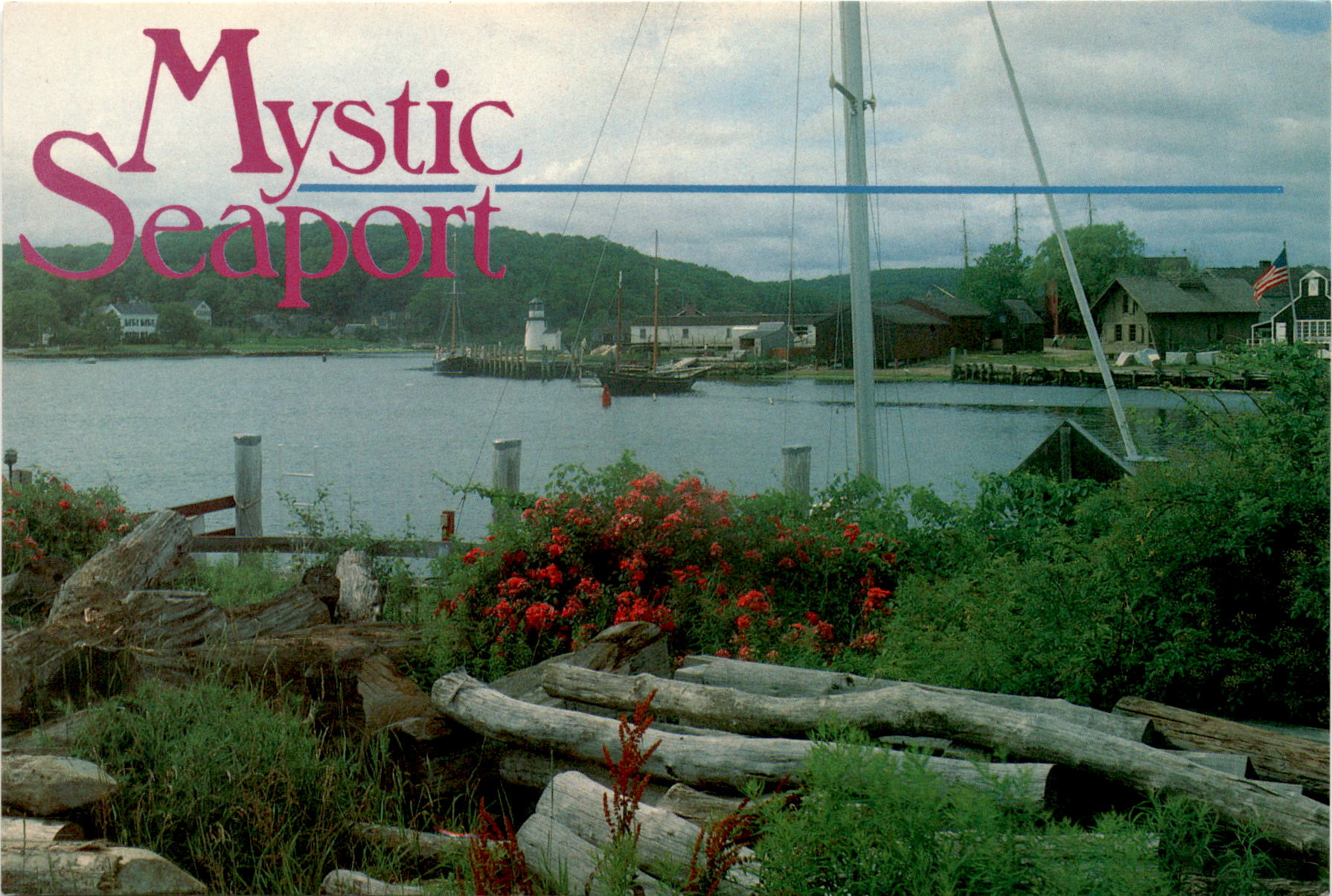 Back of PostcardThe postcard features a photo of Mystic Seaport Museum in Mystic, Connecticut, taken by James Blank. Mystic Seaport Museum is a maritime museum located on the Mystic River in Connecticut. It is known for its collection of historic ships, exhibits on maritime history, and demonstrations of traditional crafts like shipbuilding and sailmaking.