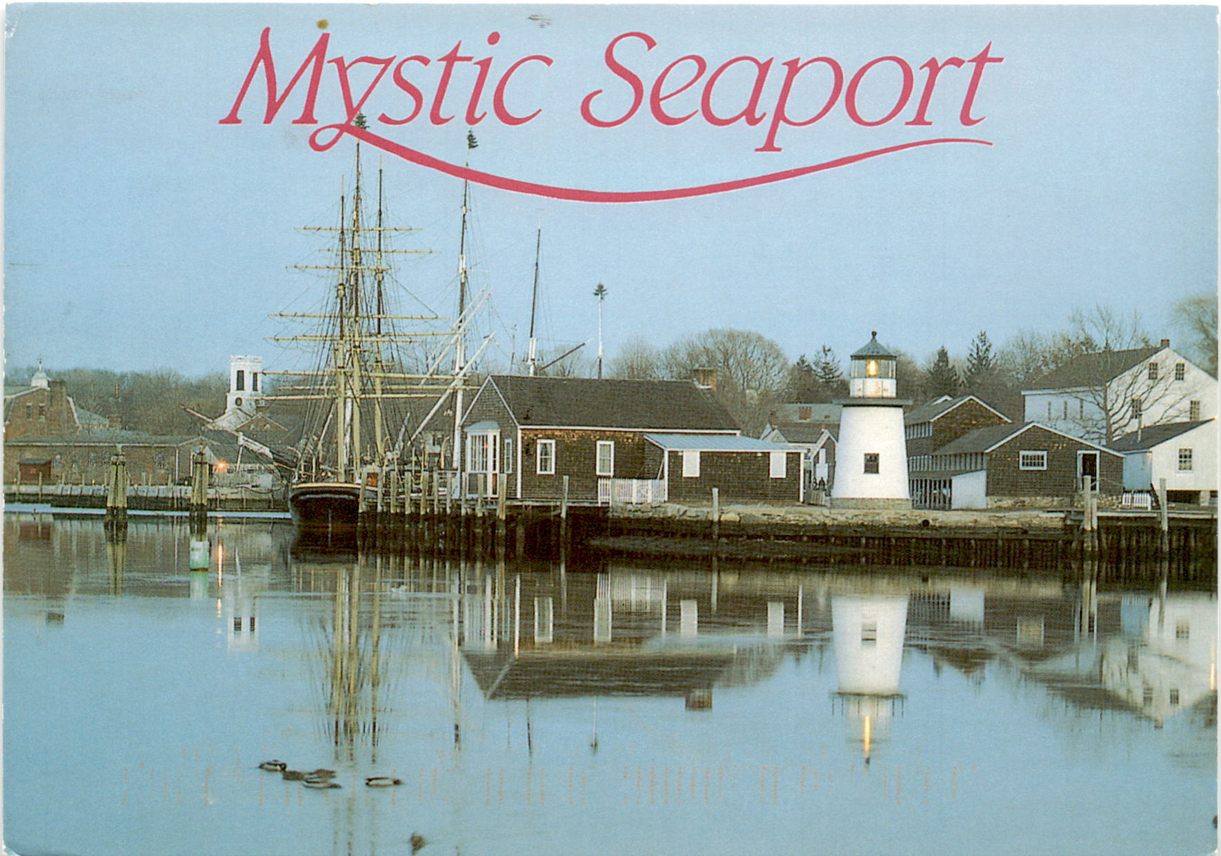 The postcard is a thank-you note referencing a visit to Mystic Seaport, located in Mystic, Connecticut. Mystic Seaport is a maritime museum that recreates an old New England seaport, showcasing historic ships, a preservation shipyard, a planetarium, and various exhibits related to maritime history.