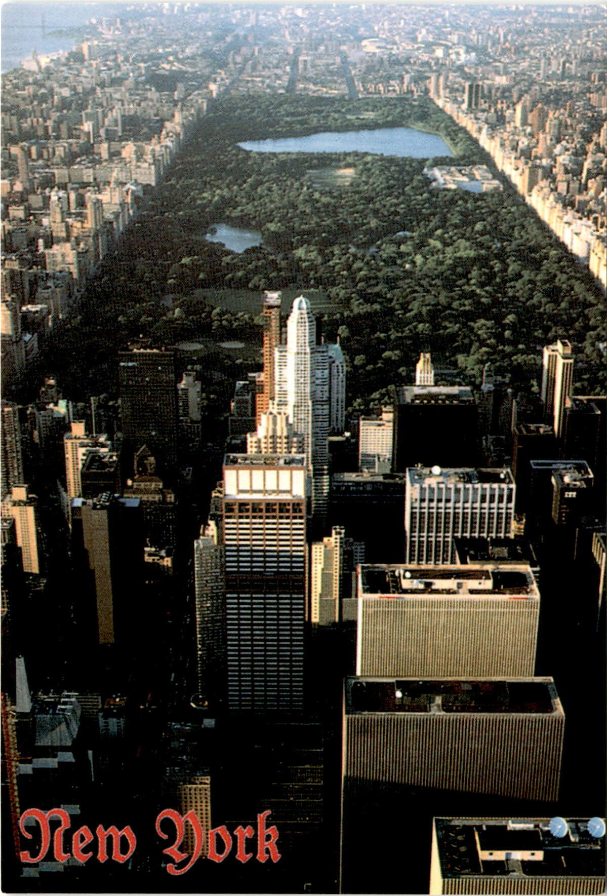 The front of the postcard features a panoramic view of Midtown Manhattan and Central Park in New York City. The photo was taken by Alan Schein. The back of the postcard includes information about the printing location in Canada, the unique identification number, and details about City Merchandise Inc. based in Brooklyn, New York.