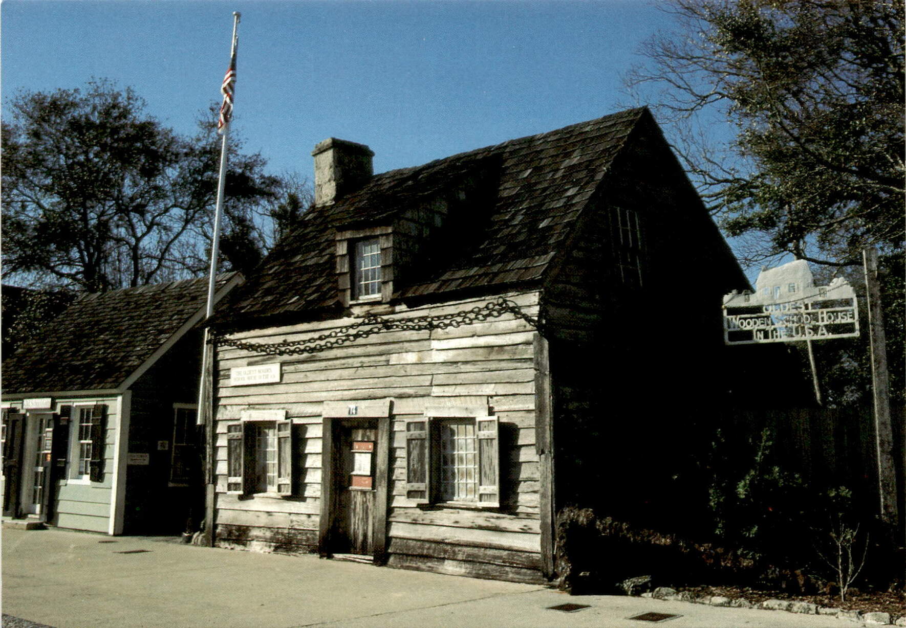The postcard features the oldest wooden schoolhouse in the USA, located in St. Augustine, Florida. Built in the early 18th century using cypress and cedar, it stands as the original building on its original site. The photograph on the postcard was taken by Doug Brown in 1986 for Graphics Ink Design Studio in St. Augustine, Florida.St.