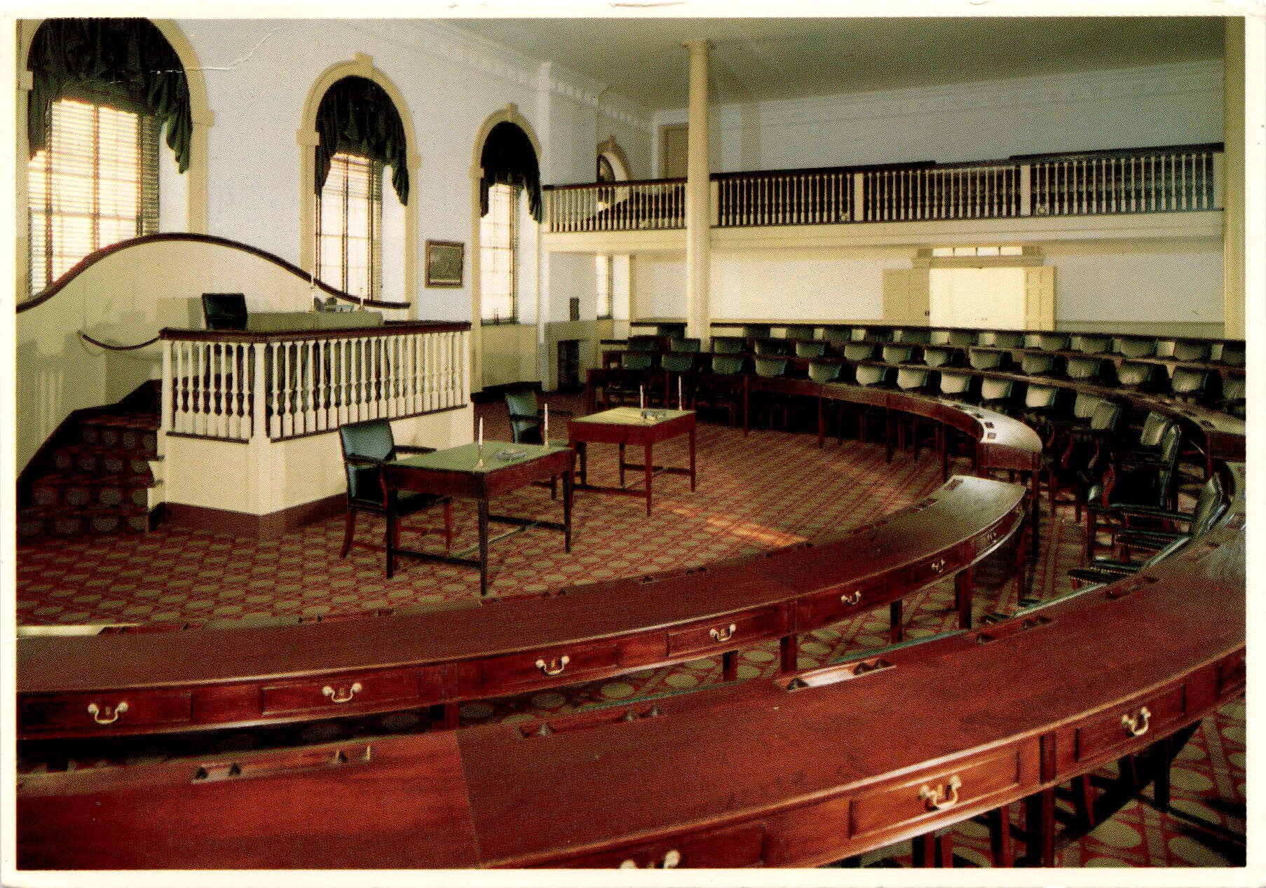 The postcard features a photo of the House of Representatives Chamber in Congress Hall, located in Independence National Historical Park in Philadelphia, Pennsylvania. The chamber was used by members of the House from 1790 to 1800, where they played a crucial role in shaping the new constitution and establishing it as a functioning government.