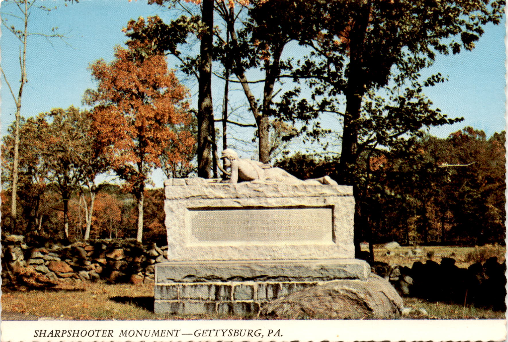 The postcard mentions the 96th Regiment of Pennsylvania Volunteers at Gettysburg, Pennsylvania, specifically highlighting the Sharshooter Monument. The regiment was organized and mustered in at Pitts Valley in Schuylkill County, Pennsylvania. It was mustered out at Estoville, Pennsylvania, near Dover.