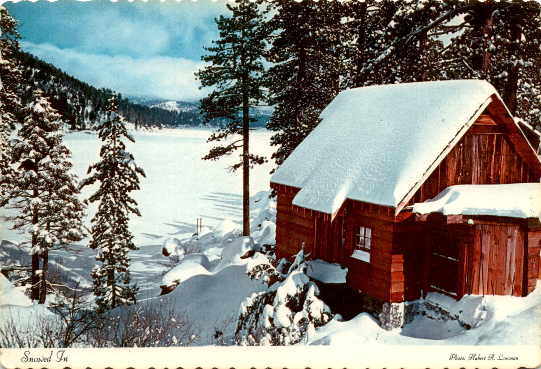 This postcard features a photo of a winter scene in the Pocono Mountains, taken by Hubert A. Lowman and distributed by Pocono Scenicards & Photographics in Stroudsburg, Pennsylvania. The image captures the beauty of the snow-covered mountains, lake, and lodge, transforming the landscape into a winter fairyland.