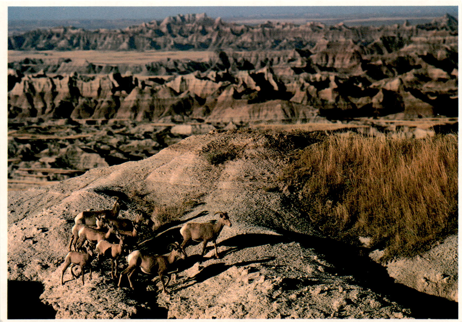 The postcard features a photograph of Rocky Mountain Bighorn Sheep in Badlands National Park, South Dakota. Badlands National Park is known for its rugged terrain, eroded buttes, and steep hills. The park is home to various wildlife, including bighorn sheep, which are well-adapted to the challenging landscape of the area.