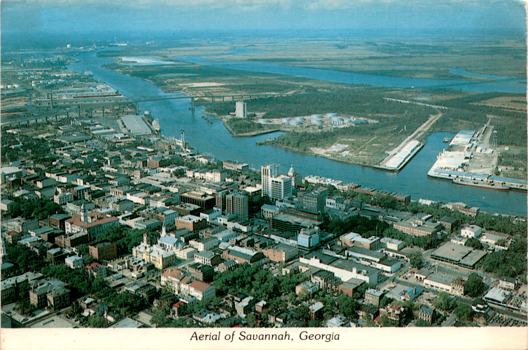The postcard features an aerial view of Savannah, Georgia, showcasing its historic and picturesque downtown area. The view is from the Drayton looking northeast, capturing the city’s business section and the Talmadge Memorial Bridge spanning the Savannah River in the background. The photo was taken by Bob Glander and distributed by Dixie News Co.