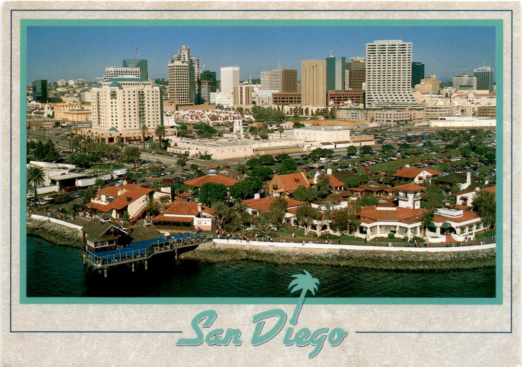 This postcard features an aerial view of San Diego’s Sea Port Village, taken by photographer James Blank. The image showcases the picturesque waterfront area of San Diego, known for its shops, restaurants, and entertainment options. Sea Port Village is a popular tourist destination located along the San Diego Bay, offering stunning views of the harbor and the city skyline.