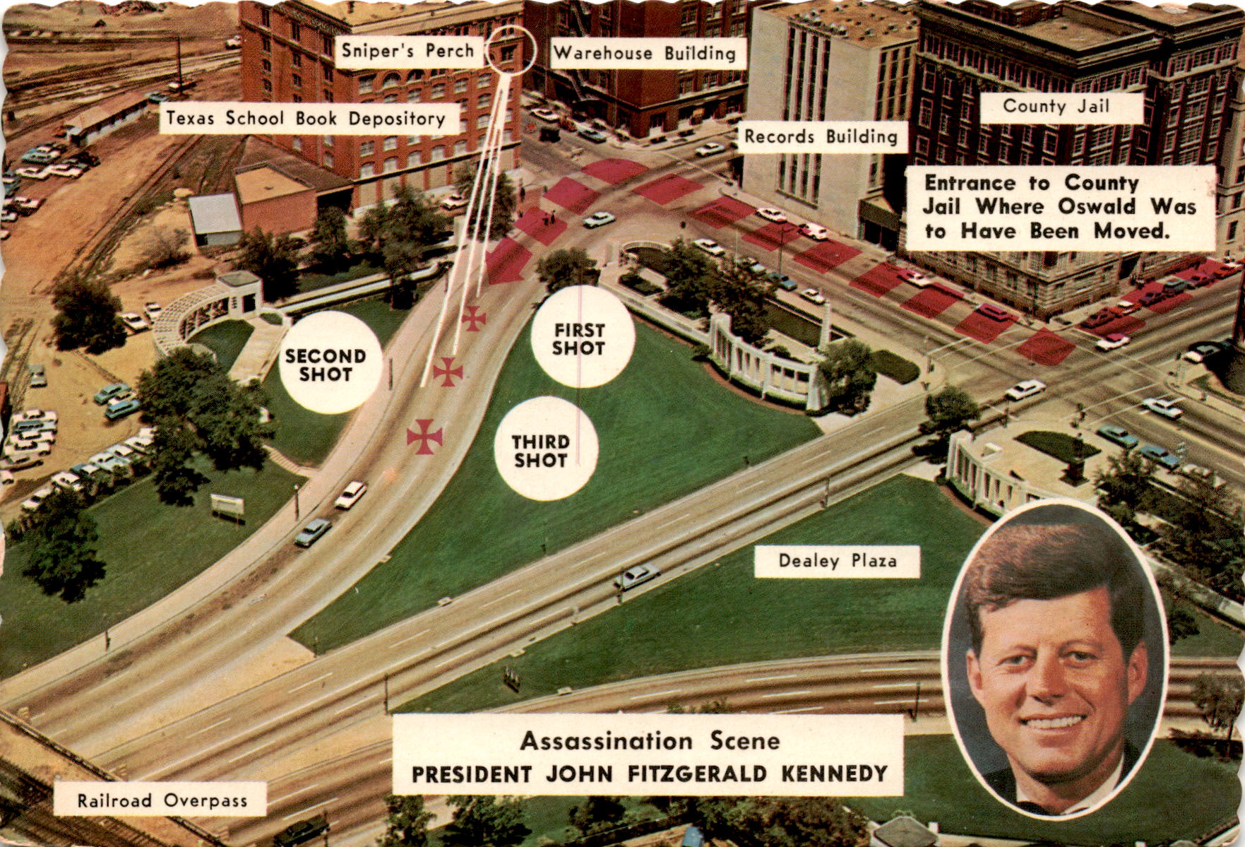 The postcard depicts various locations and aspects related to the assassination of President John F. Kennedy on November 22, 1963, in Dallas, Texas. – Sniper’s Perch: Likely referencing the location where Lee Harvey Oswald allegedly fired shots at President Kennedy from the Texas School Book Depository.