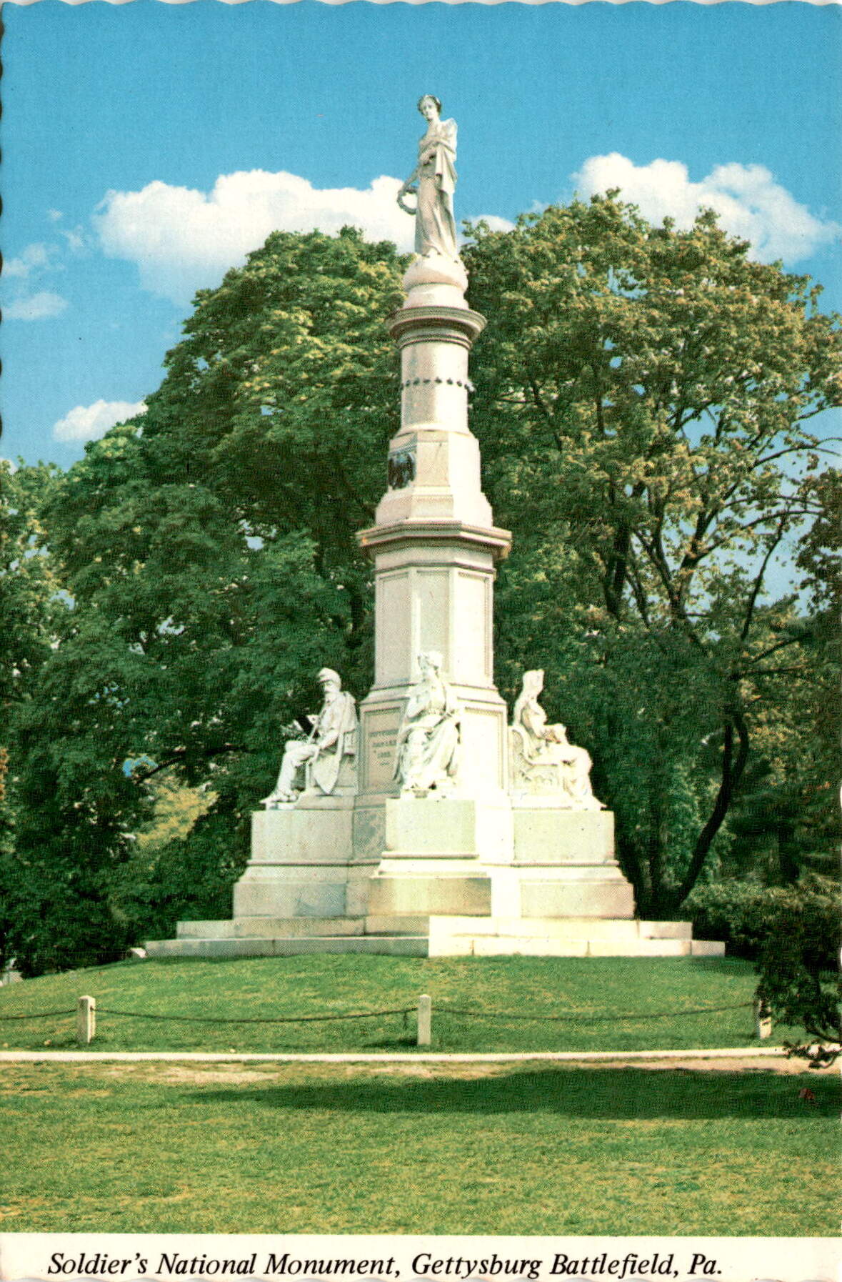The postcard features an image of the Soldier’s National Monument at the Gettysburg Battlefield in Pennsylvania. The monument is situated in the National Cemetery, the final resting place of over 3600 Union soldiers. It is located close to the spot where President Abraham Lincoln delivered his famous Gettysburg Address.