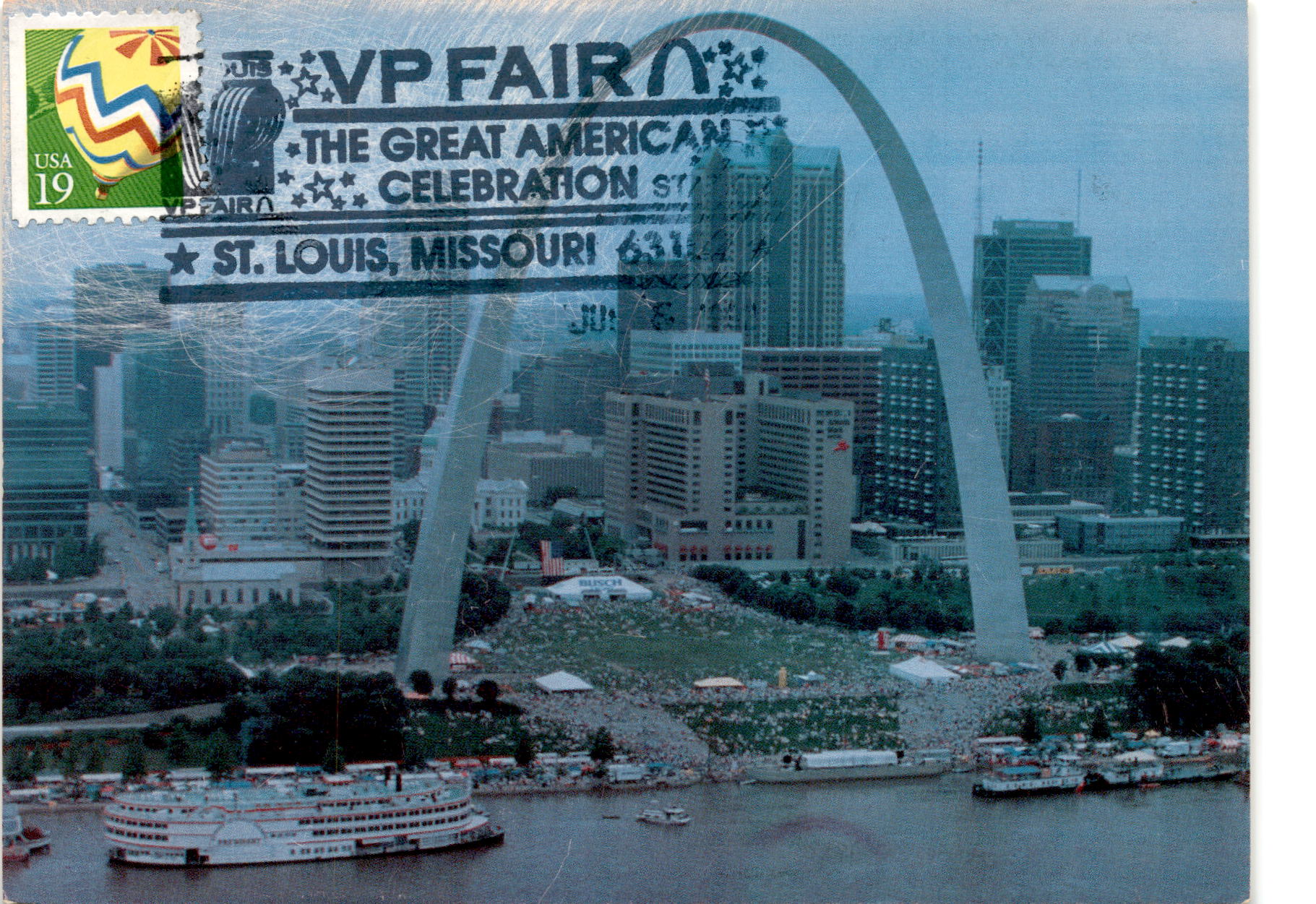 The postcard is promoting the VP Fair, also known as the Great American Celebration, held in St. Louis, Missouri, every 4th of July. The event takes place on the grounds of the Jefferson National Memorial in Downtown St. Louis. The celebration is considered America’s biggest birthday party.St.