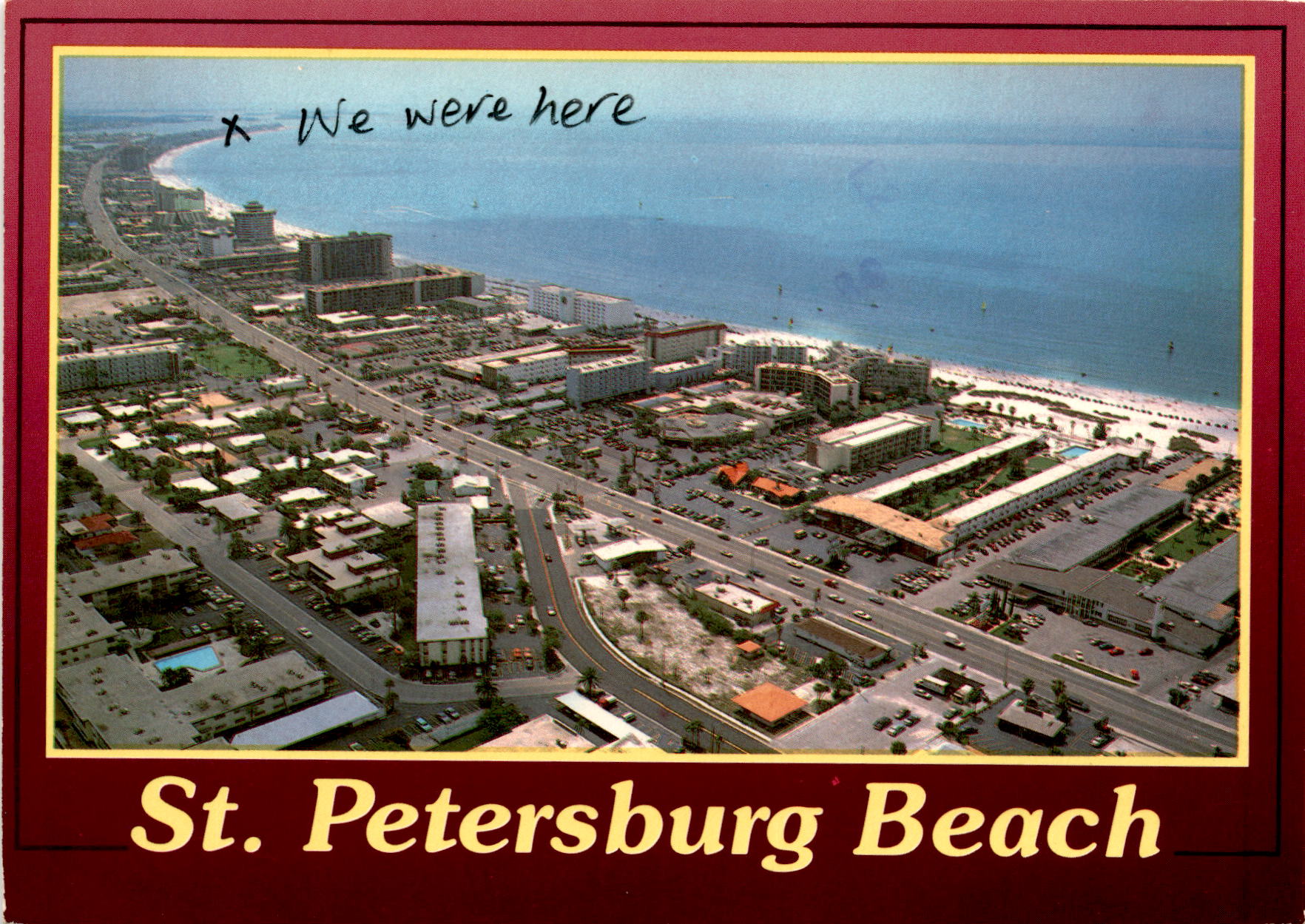 The postcard is from St. Petersburg Beach, a popular destination known for its beautiful beachside hotels and mild winters. The sender thanks John for a gift of an art nouveau book and a basket of goodies. The sender expresses admiration for the book and wishes John a wonderful 1990. The postcard is addressed to John Curley, Jr.