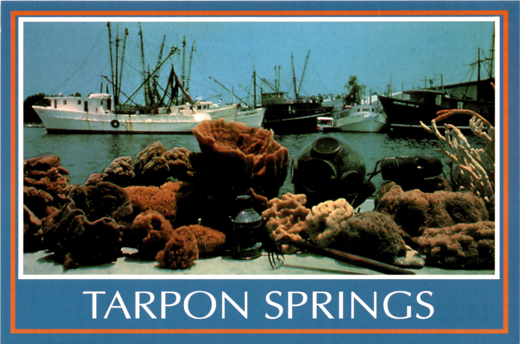 The postcard advertises the town of Tarpon Springs in Florida, known for its sponge diving industry. The front of the postcard features sponges on the docks, highlighting the significance of this trade in the area. The St. Nicholas Boat Line in Tarpon Springs offers sponge diving exhibitions, allowing visitors to experience and learn about this traditional practice.