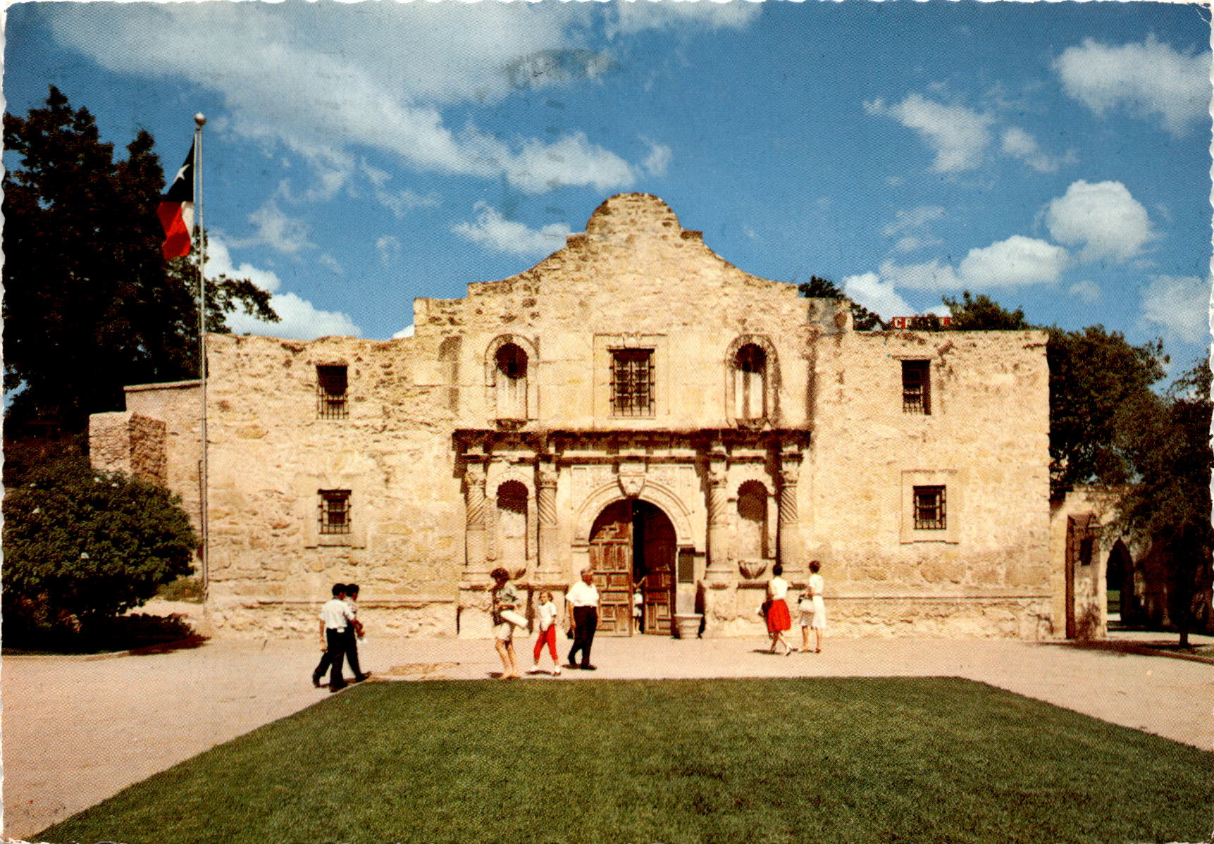 The postcard features an image of The Alamo in San Antonio, Texas, which was built in 1718 as a church and fortress. It became a symbol of Texas independence during the Texas-Mexican Independence War in 1836 when it was defended and ultimately lost to Mexican forces. The phrase Remember the Alamo became synonymous with Texas independence.