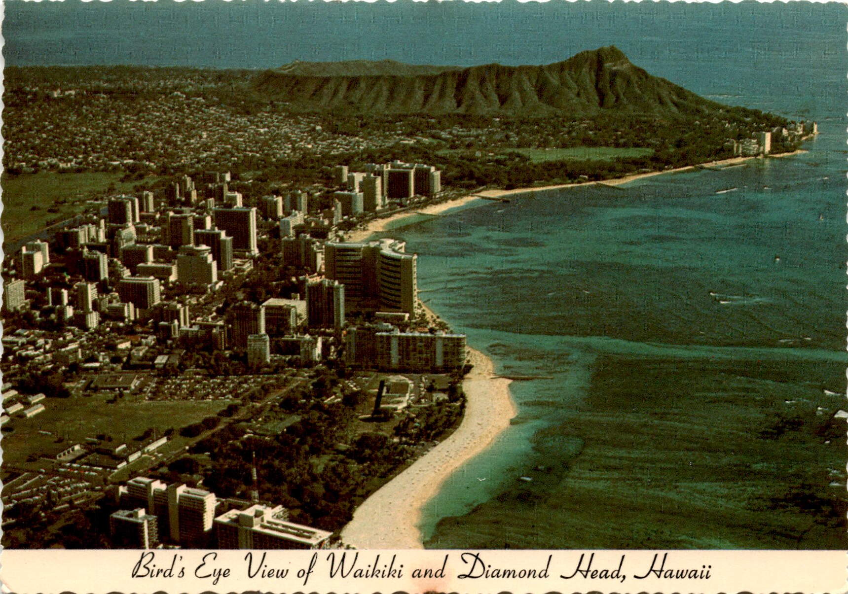 The postcard depicts a bird’s eye view of Waikiki and Diamond Head in Hawaii. Waikiki is known for its beautiful white sandy beaches and luxurious hotels, while Diamond Head is a famous extinct volcano. The image captures the new hotels of Waikiki Beach and the majestic Diamond Head, both illuminated by the afternoon sun.