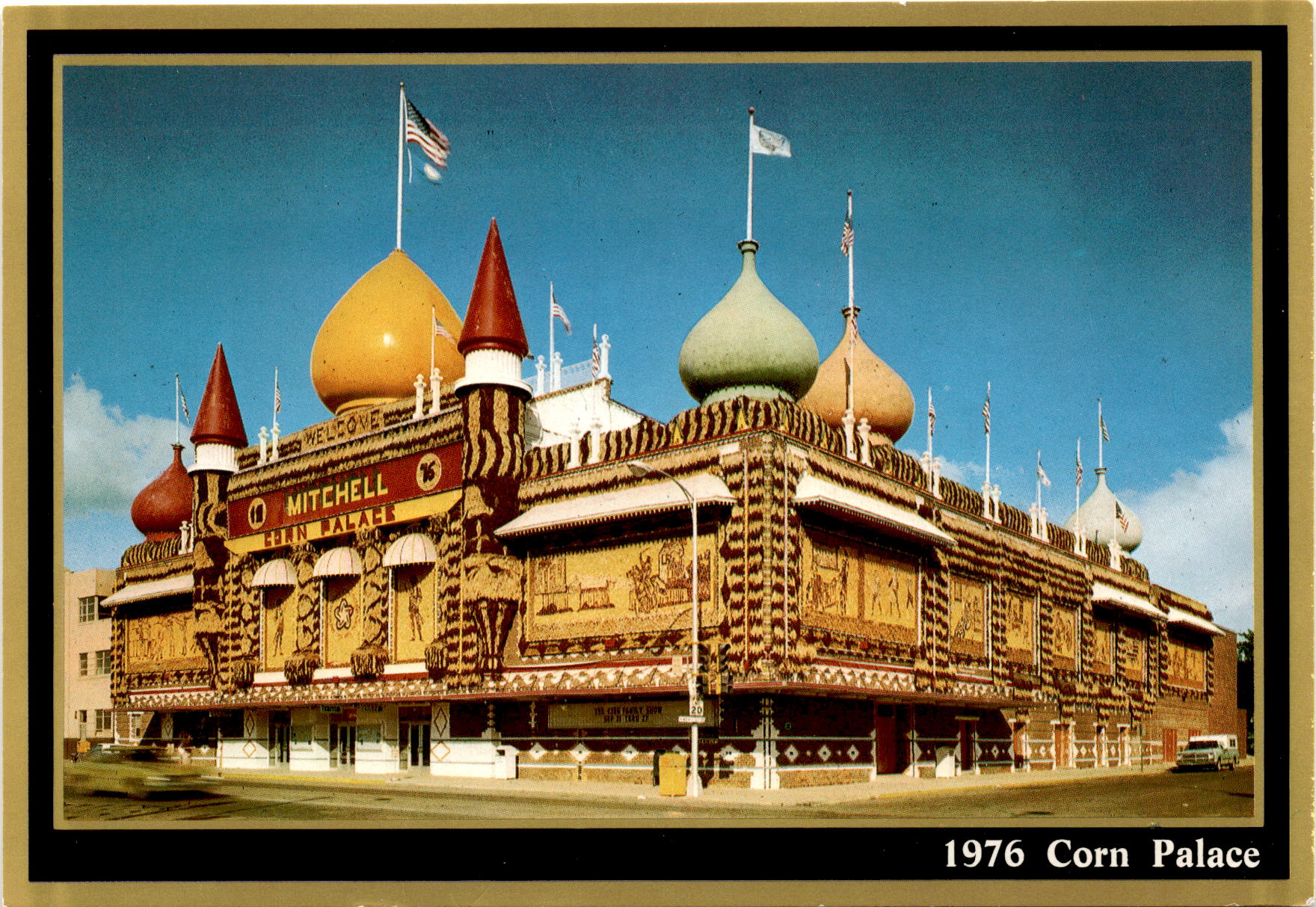 The postcard features an image of the Corn Palace in Mitchell, South Dakota, showcasing its unique design made of corn and other natural materials. The Corn Palace is known as the World’s Only Corn Palace and is a popular tourist attraction, drawing over 500,000 visitors annually.