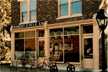 The postcard features the Wright Cycle Co., known as the Birthplace of Aviation, where the Wright brothers conducted experiments and built the world’s first successful…