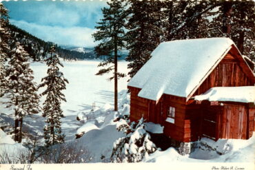This postcard features a photo of a winter scene in the Pocono Mountains, taken by Hubert A. Lowman and distributed by Pocono Scenicards & Photographics…