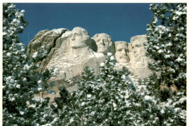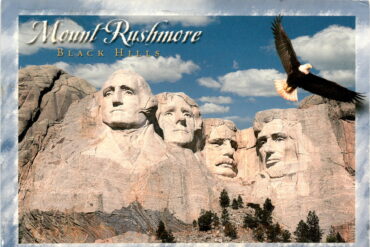 The postcard features an image of Mount Rushmore, a famous monument located in the Black Hills of South Dakota. The front of the postcard shows…