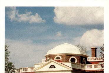 The postcard features the West Front of Monticello, the historic home of Thomas Jefferson. The flower beds seen in the image were laid out by…