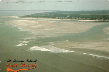 The postcard features a photograph of East Beach on St. Simons Island, Georgia, taken by J. F. Duran in January 1990. St. Simons Island is…